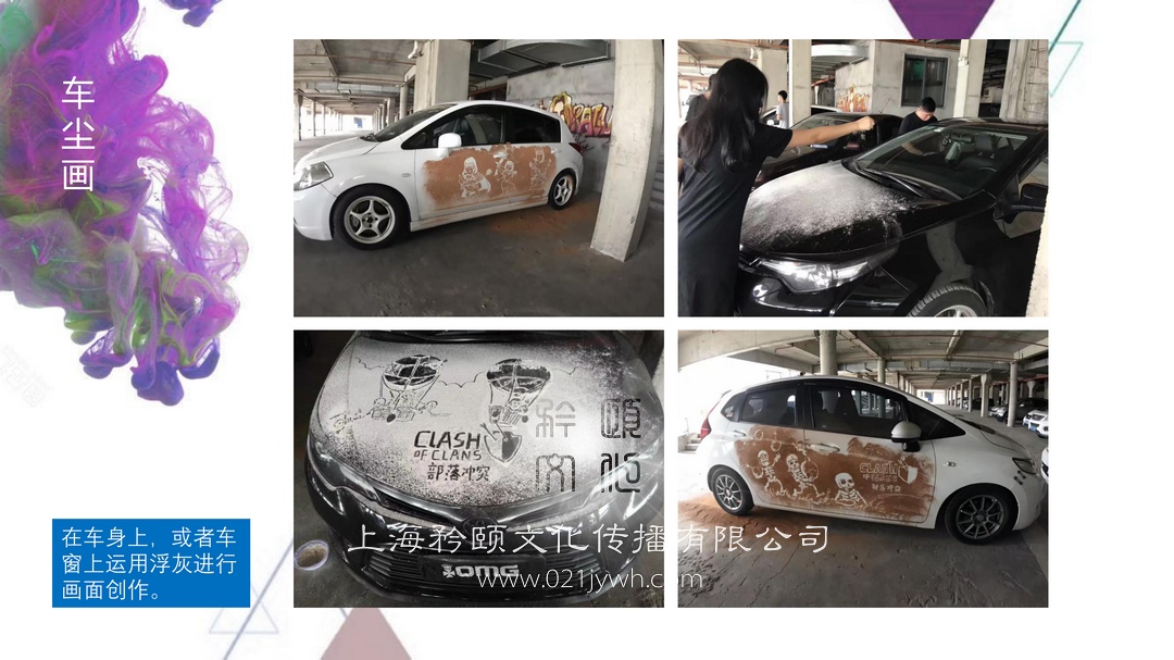 車塵畫(huà)在車身上,或者車窗上運(yùn)用浮灰進(jìn)行畫(huà)面創(chuàng)作。