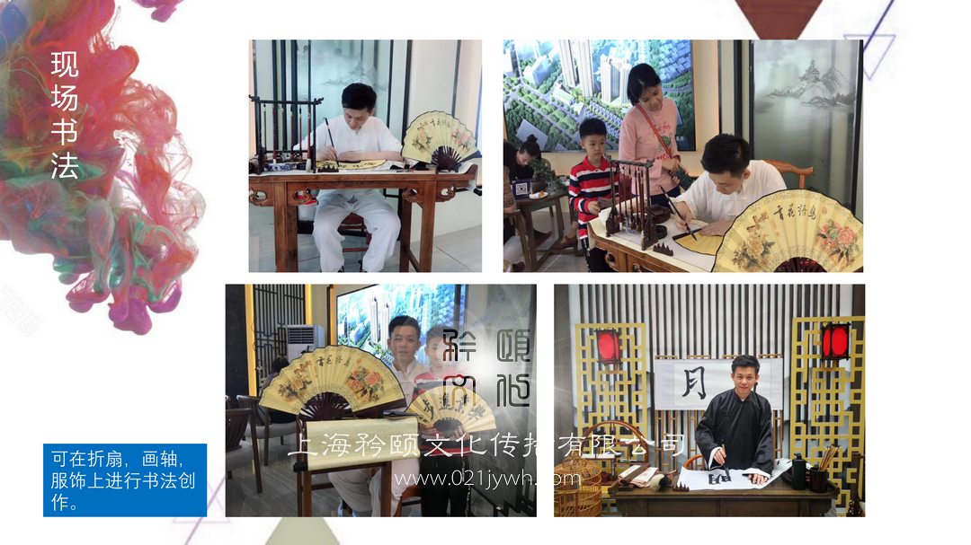 現(xiàn)場(chǎng)書(shū)法可在折扇,畫(huà)軸,服飾上進(jìn)行書(shū)法創(chuàng)作。