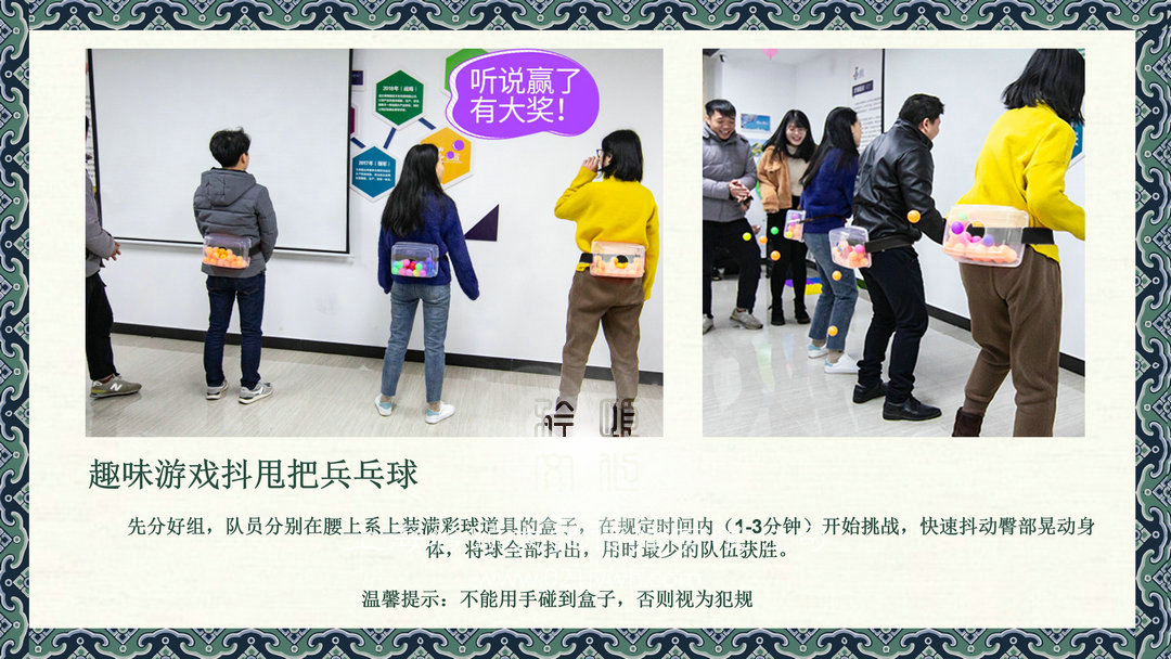 先分好組,隊(duì)員分別在腰上系上裝滿(mǎn)彩球道具的盒子,在規(guī)定時(shí)間內(nèi)(1-3分鐘)開(kāi)始挑戰(zhàn),快速抖動(dòng)臀部晃動(dòng)身體,將球全部抖出,用時(shí)最少的隊(duì)伍獲勝。