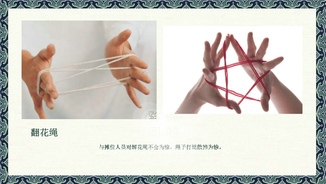 翻花繩,與攤位人員對(duì)解花繩不會(huì)為輸,繩子打結(jié)散掉為輸。