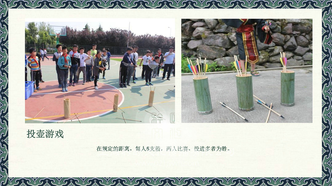 投壺游戲,在規(guī)定的距離,每人5支箭,兩人比賽,投進(jìn)多者為勝。