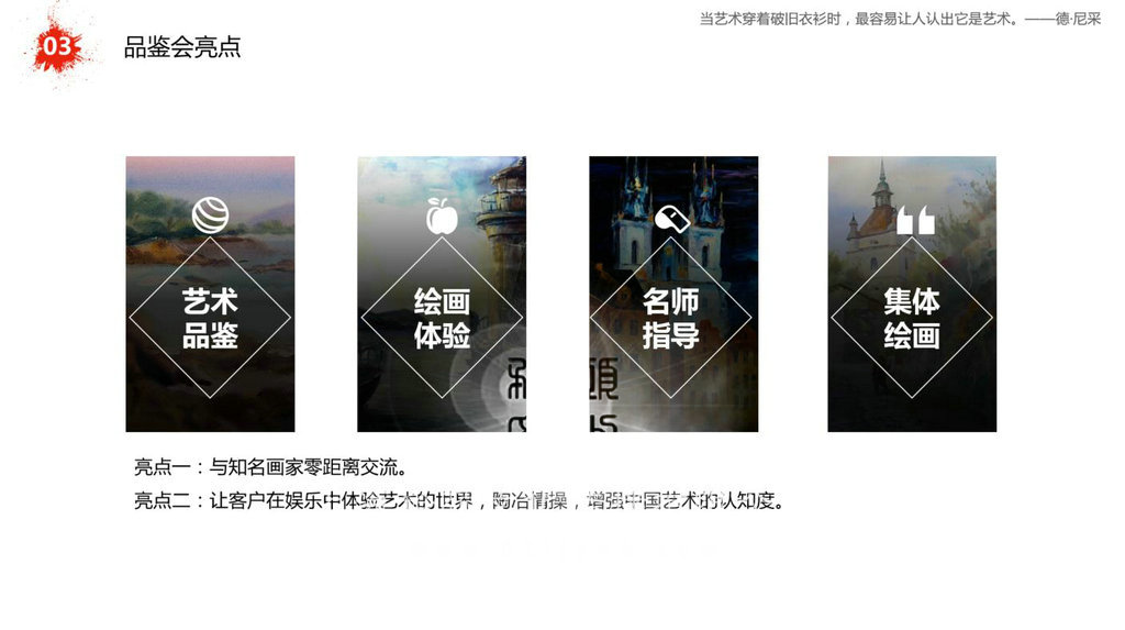 亮點二:讓客戶在娛樂中體驗藝術(shù)的世界,陶冶情操,增強中國藝術(shù)的認(rèn)知度。