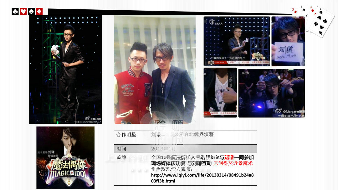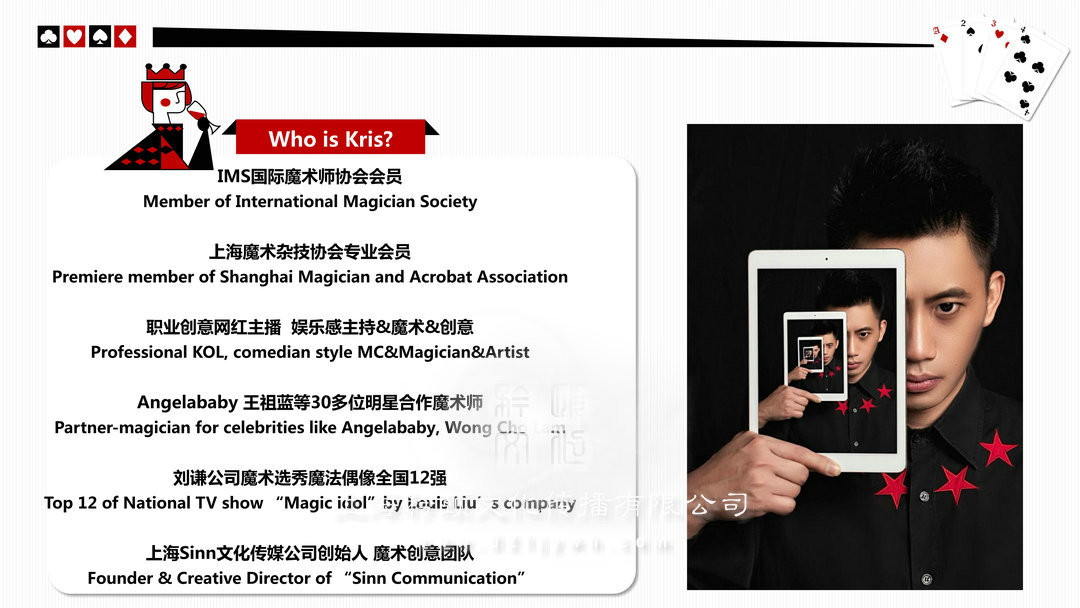 上海大學(xué)本科畢業(yè),年輕卻有穩(wěn)重大氣氣場,有親和力,帥氣,17歲加入了上海魔術(shù)雜技協(xié)會專業(yè)會員,12年演出經(jīng)驗,百余場演出經(jīng)歷,語言臺風(fēng)幽默,以融合中西方創(chuàng)意和潮流表演方式讓每個觀眾感染了魔術(shù)的神奇,曾經(jīng)上海電視臺節(jié)目與劉謙互動表演   大型真人秀人氣劉謙節(jié)目《魔法偶像》全國12強人氣選手, 與劉謙,angelababy,吳尊,迪麗熱巴,王凱等20多位明星合作舞臺造型多變,從帥氣的外型和表演風(fēng)格都時常被客戶和經(jīng)紀(jì)人稱為“小劉謙”,拍攝了多支商業(yè)廣告,電視臺宣傳片,成功策劃了諸多世界500強,奢侈品公司,明星類創(chuàng)意演出項目,深受好評。