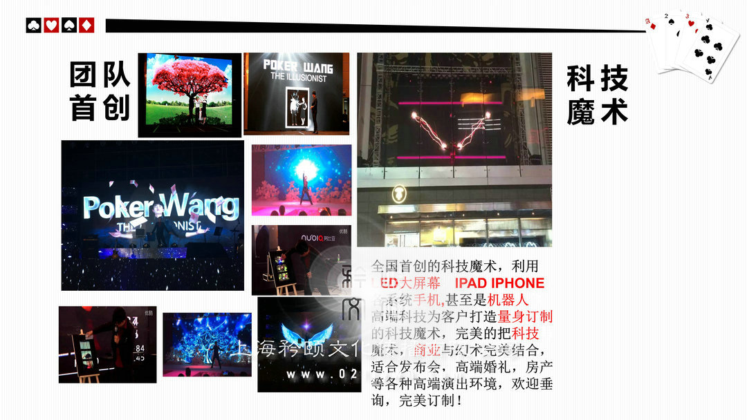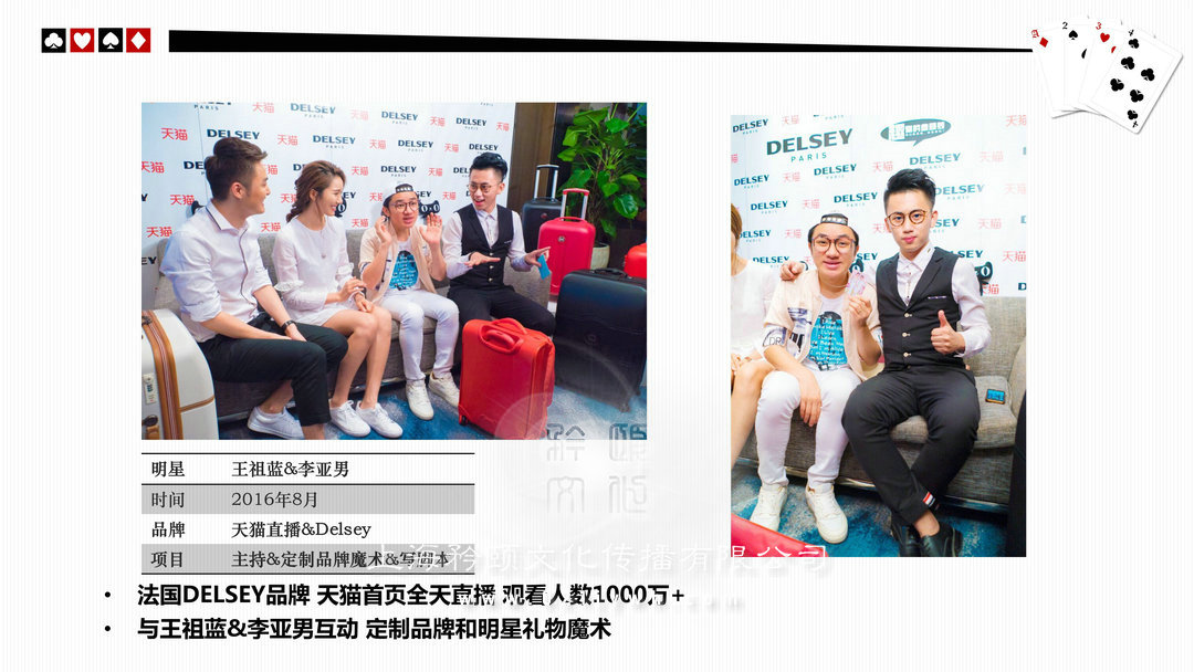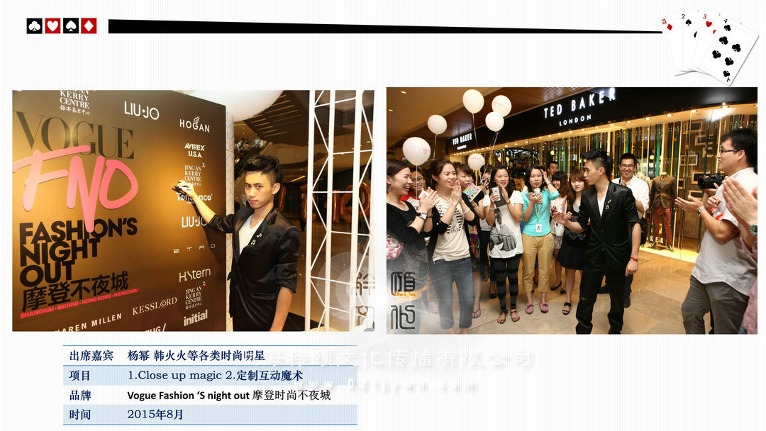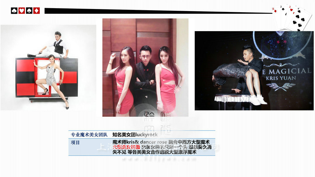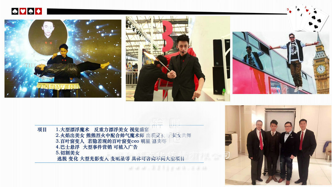 魔術(shù)師上海高端私人派對/酒會(high-end personal party)政府或企業(yè)大型晚會/比賽(The government or enterprises,big party/game)新聞發(fā)布會/時裝發(fā)布會/明星見面歌友會/簽約儀式(news release conference)企業(yè)年會/剪彩/開盤(Enterprise celebration)企業(yè)酒會/慶典(Enterprise cocktail party)新品推廣活動/商品訂貨(Promotion of new activities)各類展覽/展銷(show,exhibition)/拍賣(auction)西式婚禮/中式婚禮/主題婚禮/小孩彌月/壽宴(different weddings)合作明星 Celebrities劉謙,angelababy,趙麗穎,迪麗熱巴,吳尊,王凱,王子文,黃軒,王麗坤,王祖藍,網(wǎng)紅艾克里里,林允,周星馳,小S,林志玲,陳小春,陳柏霖,品冠,水木年華,黃子佼,吳莫愁,劉力揚,戚薇,李云迪,張翰,周冬雨,馬天宇,劉愷威,黃日華等眾多明星 (全部有真實合照和資料)表演足跡曾踏(Host footprints)