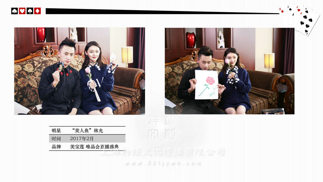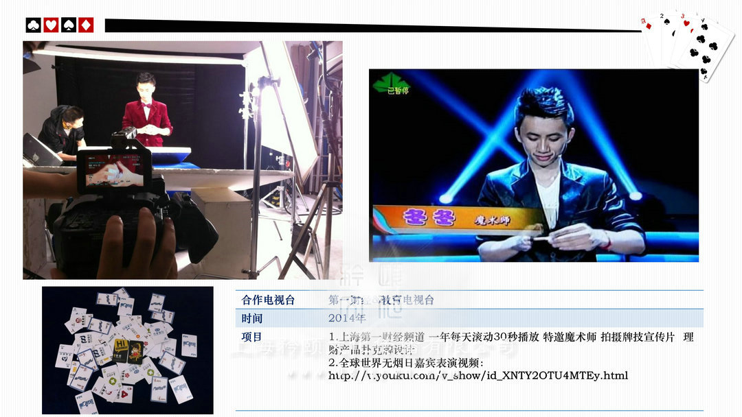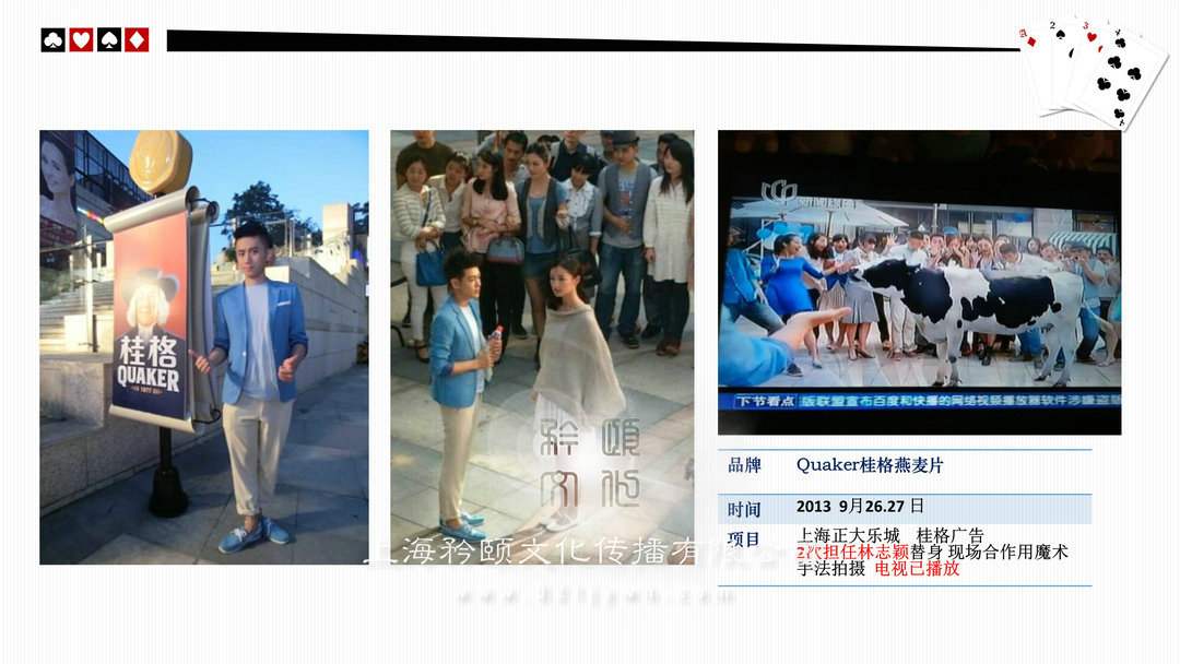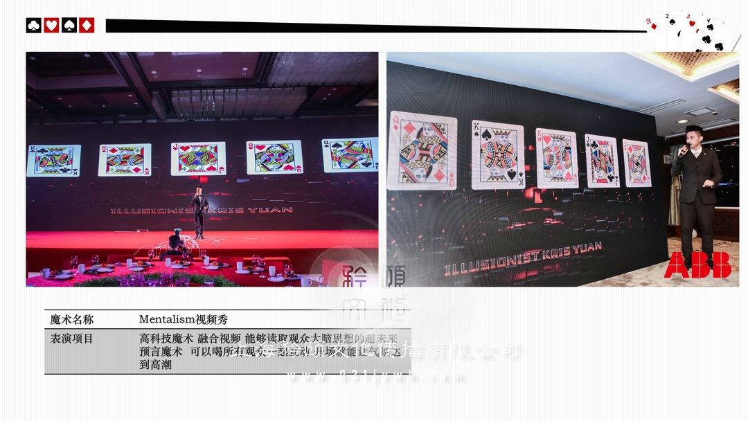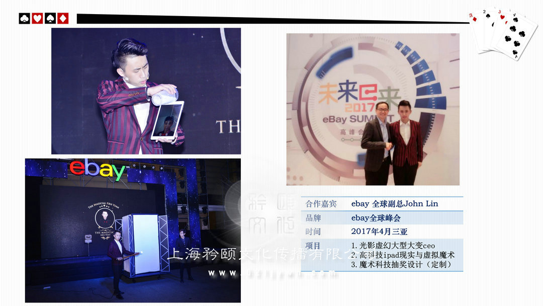 魔術(shù)師上海高端私人派對/酒會(high-end personal party)政府或企業(yè)大型晚會/比賽(The government or enterprises,big party/game)新聞發(fā)布會/時裝發(fā)布會/明星見面歌友會/簽約儀式(news release conference)企業(yè)年會/剪彩/開盤(Enterprise celebration)企業(yè)酒會/慶典(Enterprise cocktail party)新品推廣活動/商品訂貨(Promotion of new activities)各類展覽/展銷(show,exhibition)/拍賣(auction)西式婚禮/中式婚禮/主題婚禮/小孩彌月/壽宴(different weddings)合作明星 Celebrities劉謙,angelababy,趙麗穎,迪麗熱巴,吳尊,王凱,王子文,黃軒,王麗坤,王祖藍,網(wǎng)紅艾克里里,林允,周星馳,小S,林志玲,陳小春,陳柏霖,品冠,水木年華,黃子佼,吳莫愁,劉力揚,戚薇,李云迪,張翰,周冬雨,馬天宇,劉愷威,黃日華等眾多明星 (全部有真實合照和資料)表演足跡曾踏(Host footprints)