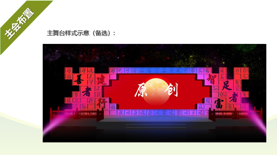 3、主舞臺右側(cè)設(shè)演講臺1座,供儀式主持人使用