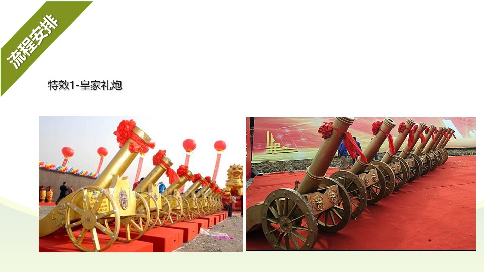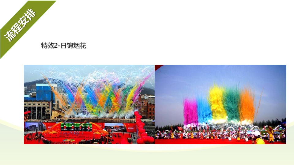 特效物資:冷焰火、高空彩煙,設(shè)置于主席臺左右(待定),禮炮等均勻分布遠離現(xiàn)場空曠地(待定)