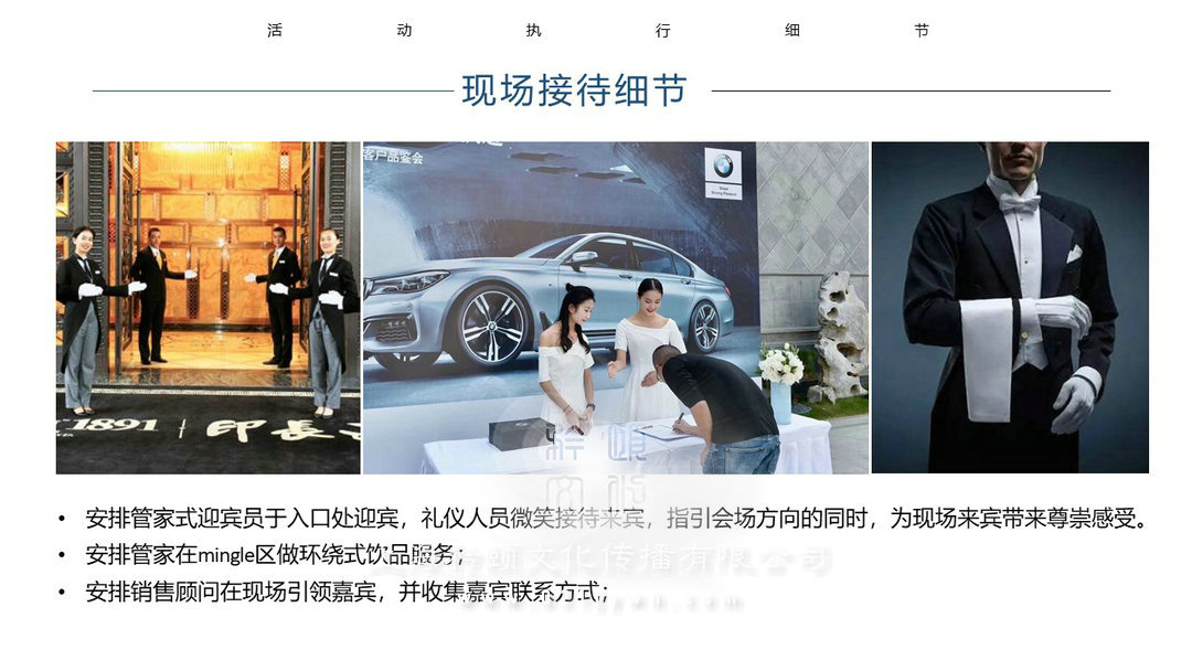 暖場區(qū)會安排侍應(yīng)生現(xiàn)場隨時(shí)為各位來賓提供專屬服務(wù);通過優(yōu)秀的異業(yè)合作 獲取高質(zhì)量 的目標(biāo)客戶。以奢侈品展示品鑒為暖場活動(dòng)亮點(diǎn),可融入國外服裝靜態(tài)秀體驗(yàn)、名表鑒賞、香水體驗(yàn)、奢侈品鑒賞等環(huán)節(jié),突出高端及高雅的生活方式理念, 活動(dòng)性強(qiáng);