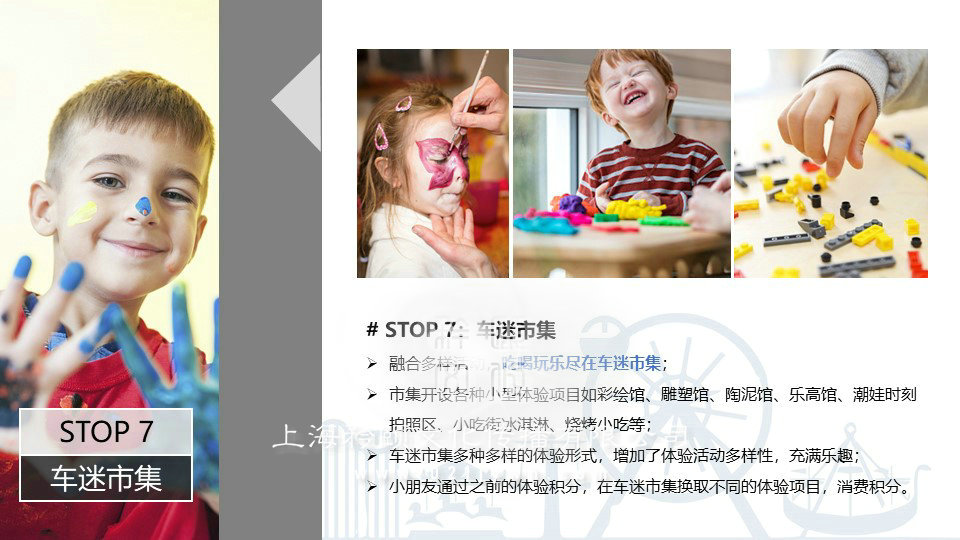 融合多樣活動,吃喝玩樂盡在車迷市集;市集開設各種小型體驗項目如彩繪館、雕塑館、陶泥館、樂高館、潮娃時刻拍照區(qū)、小吃街冰淇淋、燒烤小吃等;車迷市集多種多樣的體驗形式,增加了體驗活動多樣性,充滿樂趣;小朋友通過之前的體驗積分,在車迷市集換取不同的體驗項目,消費積分。