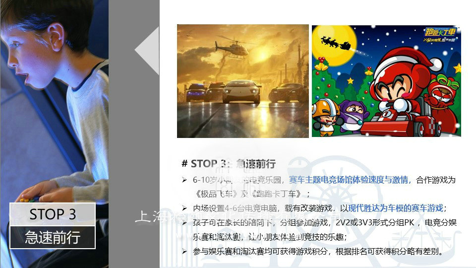 6-10歲小朋友的電競樂園,賽車主題電競場館體驗速度與激情,合作游戲為《極品飛車》及《跑跑卡丁車》 ;內(nèi)場設置4-6臺電競電腦,載有改裝游戲,以現(xiàn)代勝達為車模的賽車游戲;孩子可在家長的陪同下,分組參加游戲,2V2或3V3形式分組PK ,電競分娛樂賽和淘汰賽,讓小朋友體驗到競技的樂趣;參與娛樂賽和淘汰賽均可獲得游戲積分,根據(jù)排名可獲得積分略有差別。