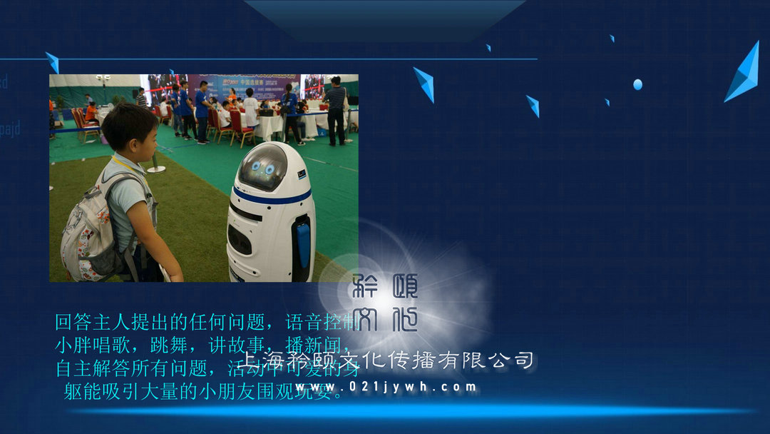 回答主人提出的任何問題,語音控制小胖唱歌,跳舞,講故事,播新聞,自主解答所有問題,活動(dòng)中可愛的身軀能吸引大量的小朋友圍觀玩耍。