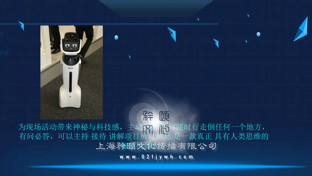 為現(xiàn)場活動(dòng)帶來神秘與科技感,主動(dòng)打招呼 可隨時(shí)行走倒任何一個(gè)地方,有問必答,可以主持 接待 講解項(xiàng)目所以信息 是一款真正 具有人類思維的智慧機(jī)器人。