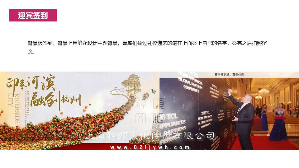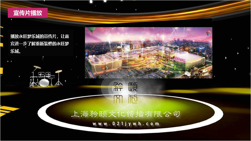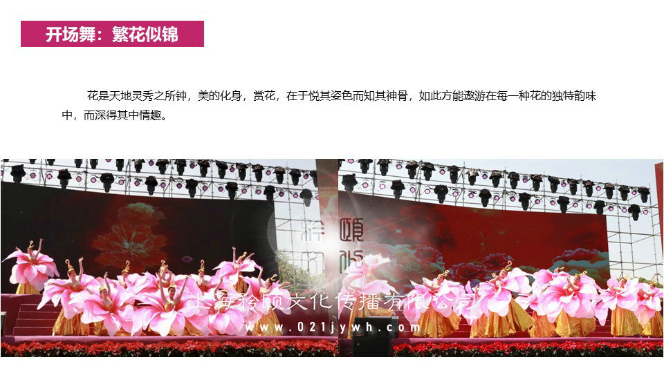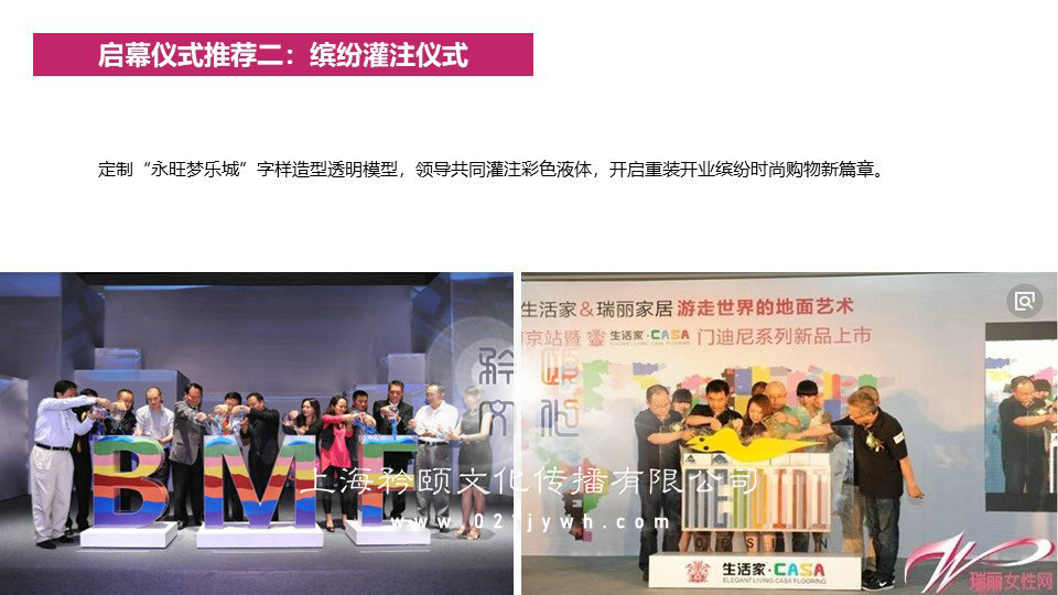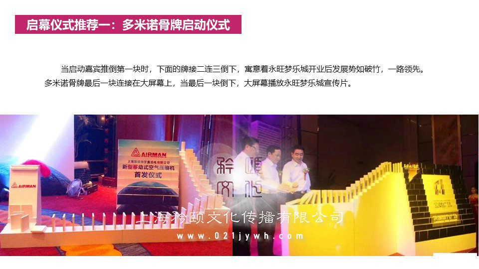 背景板簽到,背景上用鮮花設(shè)計(jì)主題背景,嘉賓們接過(guò)禮儀遞來(lái)的筆在上面簽上自己的名字,簽完之后拍照留念。禮儀小姐身穿禮服,引導(dǎo)嘉賓現(xiàn)場(chǎng)簽到,為男、女嘉賓分別佩戴胸花。高樁舞獅迎賓——迎賓通道一側(cè)設(shè)置高樁舞獅表演吸引人氣及打造喜慶勢(shì)氣。播放永旺夢(mèng)樂(lè)城的宣傳片,讓嘉賓進(jìn)一步了解重新裝修的永旺夢(mèng)樂(lè)城?;ㄊ翘斓仂`秀之所鐘,美的化身,賞花,在于悅其姿色而知其神骨,如此方能遨游在每一種花的獨(dú)特韻味中,而深得其中情趣。主持人開(kāi)場(chǎng),介紹此次活動(dòng)的主要領(lǐng)導(dǎo)以及活動(dòng)主題和內(nèi)容,歡迎廣大嘉賓的到來(lái)。領(lǐng)導(dǎo)代表和嘉賓代表進(jìn)行致辭,闡述對(duì)此次開(kāi)業(yè)活動(dòng)的意義,并且對(duì)未來(lái)做出展望,最后感謝到場(chǎng)的嘉賓。當(dāng)啟動(dòng)嘉賓推倒第一塊時(shí),下面的牌接二連三倒下,寓意著永旺夢(mèng)樂(lè)城開(kāi)業(yè)后發(fā)展勢(shì)如破竹,一路領(lǐng)先。多米諾骨牌最后一塊連接在大屏幕上,當(dāng)最后一塊倒下,大屏幕播放永旺夢(mèng)樂(lè)城宣傳片。定制“永旺夢(mèng)樂(lè)城”字樣造型透明模型,領(lǐng)導(dǎo)共同灌注彩色液體,開(kāi)啟重裝開(kāi)業(yè)繽紛時(shí)尚購(gòu)物新篇章。領(lǐng)導(dǎo)們?cè)谖枧_(tái)上共同剪彩,大門(mén)開(kāi)啟,有所謂“開(kāi)業(yè)大吉鴻運(yùn)來(lái),業(yè)績(jī)功成招福財(cái),大吉興旺財(cái)源進(jìn),吉開(kāi)貴門(mén)富如海”的美好寓意。儀式結(jié)束之后,領(lǐng)導(dǎo)、嘉賓在禮儀的引導(dǎo)下到商場(chǎng)內(nèi)進(jìn)行參觀,由專業(yè)人士講解商場(chǎng)格局、功能等。儀式結(jié)束后祥獅跟隨領(lǐng)導(dǎo)商場(chǎng)巡游,在主力店門(mén)前表演助興。