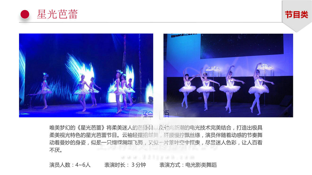 演員人數(shù):4~6人表演時(shí)長:3分鐘  表演方式:電光影類舞蹈