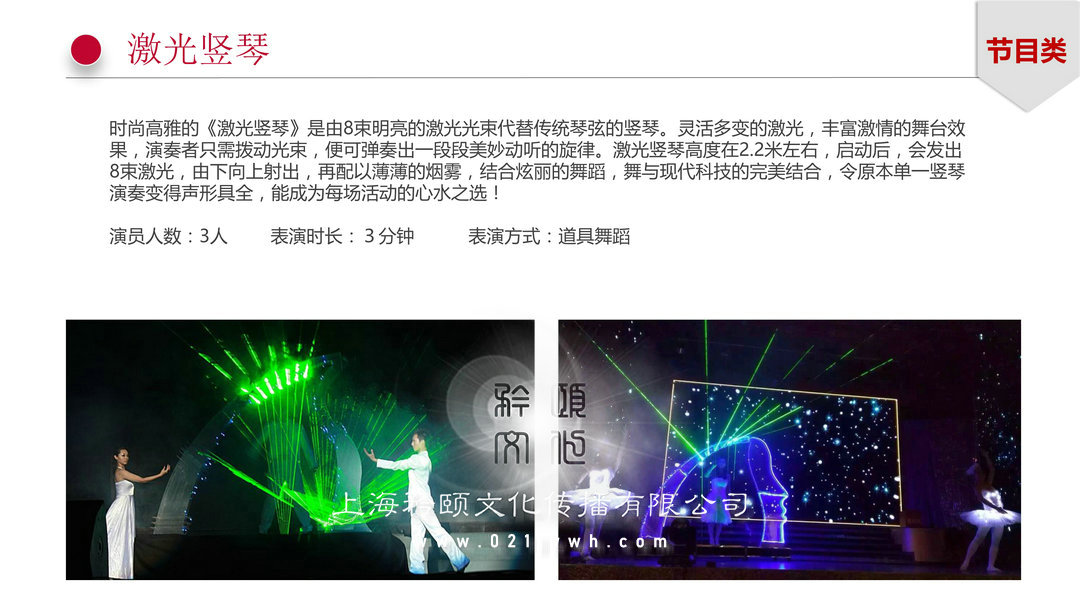 激光豎琴節(jié)目類:時(shí)尚高雅的《激光豎琴》是由8束明亮的激光光束代替?zhèn)鹘y(tǒng)琴弦的豎琴。靈活多變的激光,豐富激情的舞臺(tái)效果,演奏者只需撥動(dòng)光束,便可彈奏出一段段美妙動(dòng)聽的旋律。激光豎琴高度在2.2米左右,啟動(dòng)后,會(huì)發(fā)出8束激光,由下向上射出,再配以薄薄的煙霧,結(jié)合炫麗的舞蹈,舞與現(xiàn)代科技的完美結(jié)合,令原本單一豎琴演奏變得聲形具全,能成為每場活動(dòng)的心水之選!