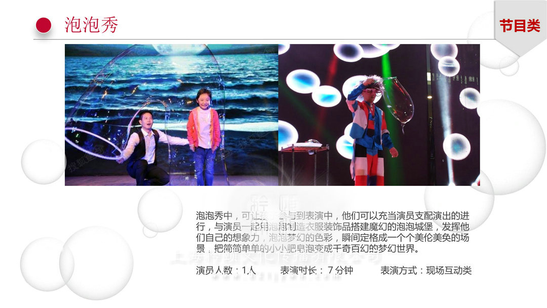 泡泡秀節(jié)目類:泡泡秀中,可讓孩子參與到表演中,他們可以充當(dāng)演員支配演出的進(jìn)行,與演員一起用泡泡制造衣服裝飾品搭建魔幻的泡泡城堡,發(fā)揮他們自己的想象力,泡泡夢幻的色彩,瞬間定格成一個(gè)個(gè)美倫美奐的場景,把簡簡單單的小小肥皂泡變成千奇百幻的夢幻世界。