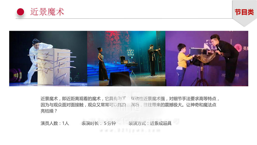 近景魔術(shù)節(jié)目類:近景魔術(shù),即近距離觀看的魔術(shù),它具有與觀眾互動(dòng)性近景魔術(shù)強(qiáng),對細(xì)節(jié)手法要求高等特點(diǎn),因?yàn)榕c觀眾面對面接觸,觀眾又常??梢杂|摸表演物,往往帶來的震撼極大。讓神奇和魔法點(diǎn)亮枯燥?