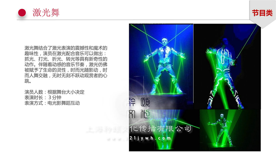 激光舞節(jié)目類:激光舞結(jié)合了激光表演的震撼性和魔術(shù)的趣味性,演員在激光配合音樂可以做出:抓光、打光、折光、轉(zhuǎn)光等具有新奇性的動(dòng)作。伴隨著動(dòng)感的音樂節(jié)奏,激光佛被賦予了生命的靈性,時(shí)而光隨影動(dòng),時(shí)而人舞交融,無時(shí)無刻不躍動(dòng)觀賞者的心跳。