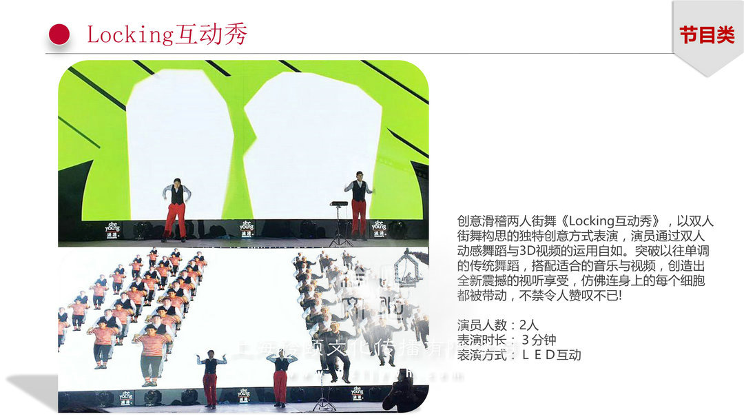 演員人數(shù):2人表演時(shí)長:3分鐘    表演方式:LED互動(dòng)