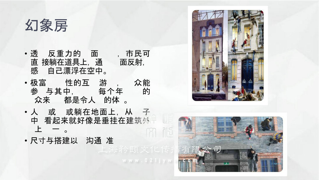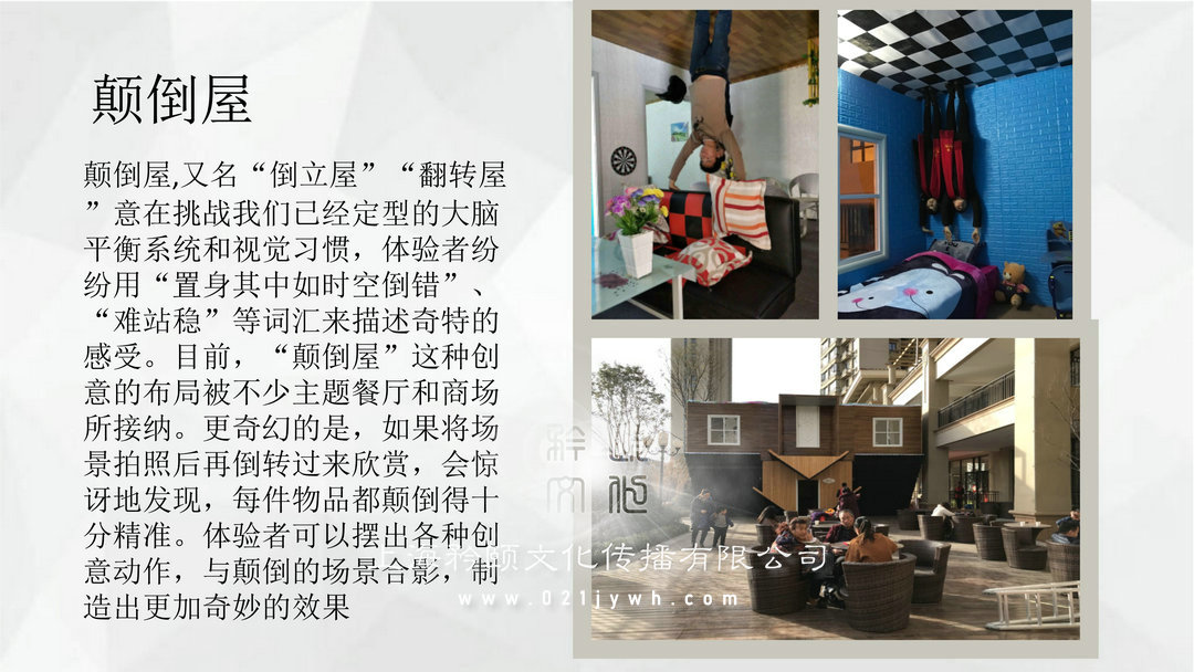 顛倒屋:顛倒屋,又名“倒立屋”“翻轉(zhuǎn)屋”意在挑戰(zhàn)我們已經(jīng)定型的大腦平衡系統(tǒng)和視覺習(xí)慣,體驗(yàn)者紛紛用“置身其中如時空倒錯”、“難站穩(wěn)”等詞匯來描述奇特的感受。目前,“顛倒屋”這種創(chuàng)意的布局被不少主題餐廳和商場所接納。更奇幻的是,如果將場景拍照后再倒轉(zhuǎn)過來欣賞,會驚訝地發(fā)現(xiàn),每件物品都顛倒得十分精準(zhǔn)。體驗(yàn)者可以擺出各種創(chuàng)意動作,與顛倒的場景合影,制造出更加奇妙的效果