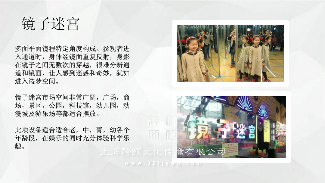 鏡子迷宮:多面平面鏡程特定角度構(gòu)成。參觀者進(jìn)入通道時,身體經(jīng)鏡面重復(fù)反射,身影在鏡子之間無數(shù)次的穿越,很難分辨通道和鏡面,讓人感到迷惑和奇妙,猶如進(jìn)入盜夢空間。鏡子迷宮市場空間非常廣闊,廣場,商場,景區(qū),公園,科技館,幼兒園,動漫城及游樂場等都適合擺放。此項(xiàng)設(shè)備適合適合老,中,青,幼各個年齡段,在娛樂的同時充分體驗(yàn)科學(xué)樂趣。