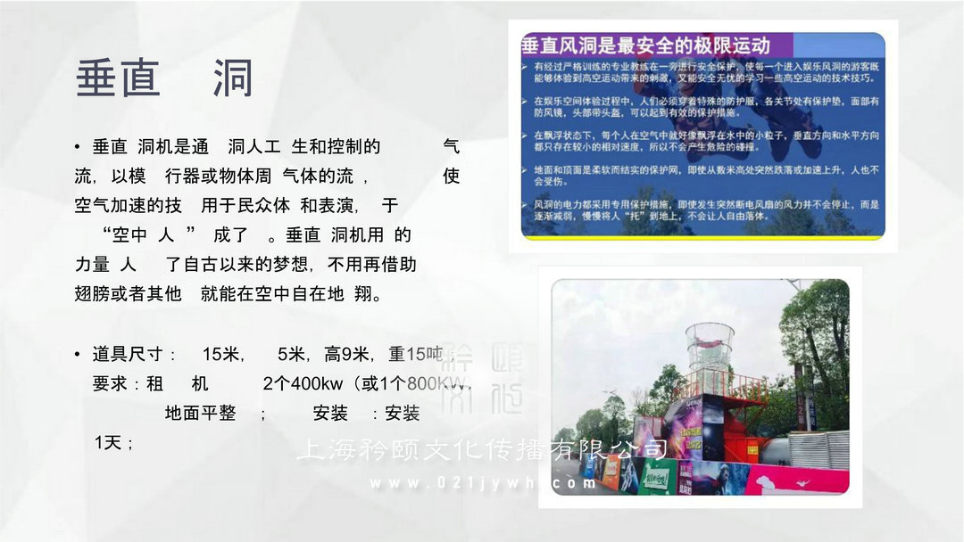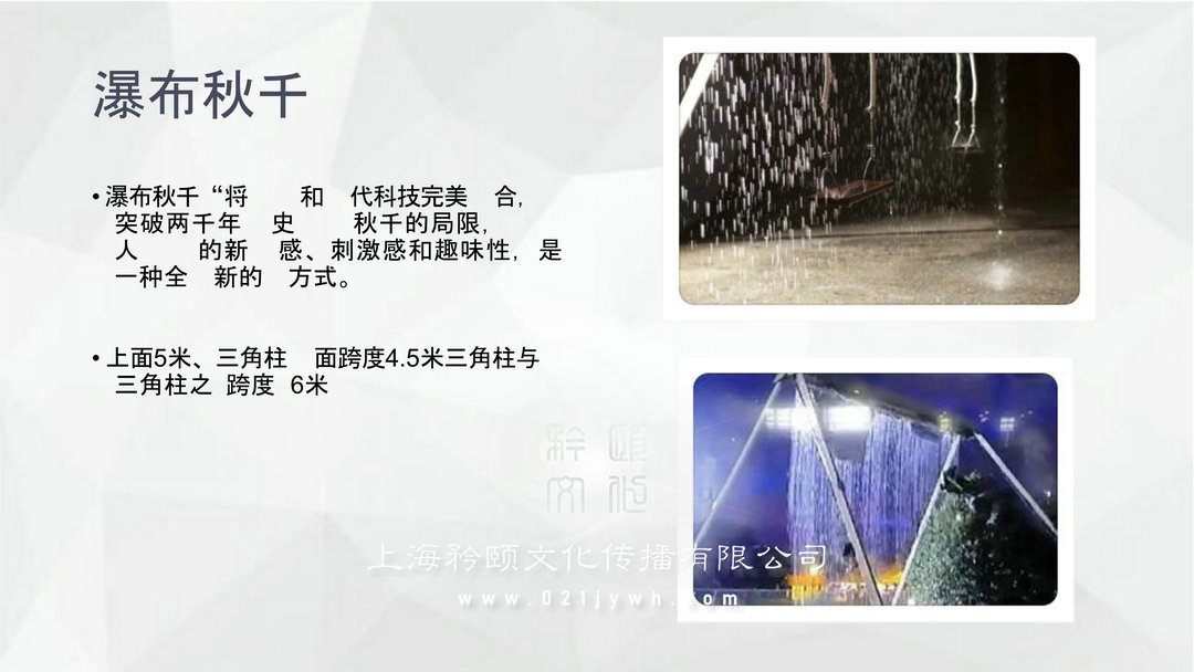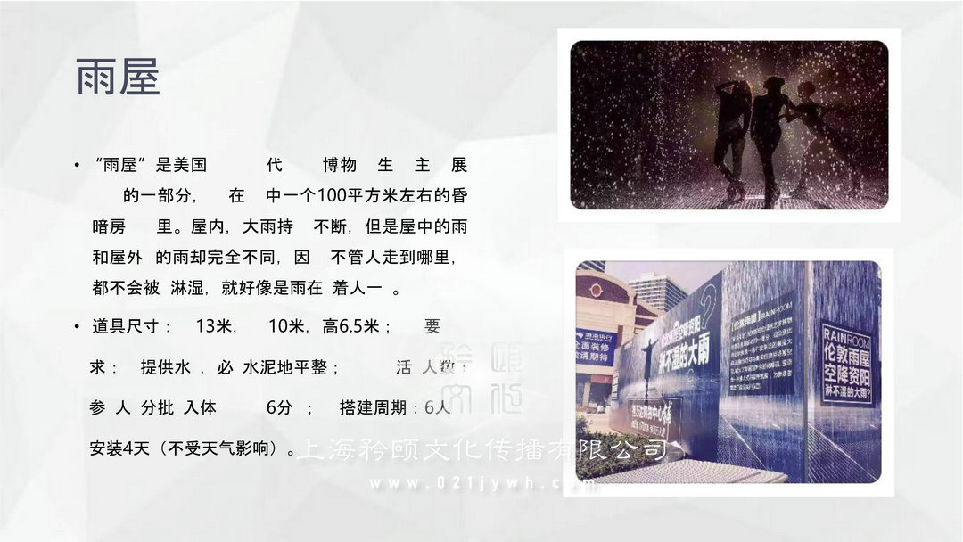 雨屋:“雨屋”是美國 代 博物 生 主 展 的一部分,在 中一個100平方米左右的昏暗房里。屋內(nèi),大雨持不斷,但是屋中的雨和屋外 的雨卻完全不同,因不管人走到哪里,都不會被 淋濕,就好像是雨在 著人一 。道具尺寸: 13米, 10米,高6.5米; 要求: 提供水 ,必 水泥地平整;