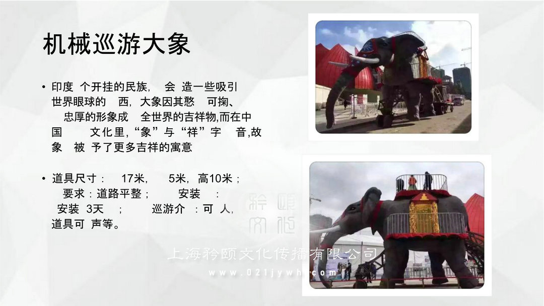 機(jī)械巡游大象:印度 個開掛的民族, 會 造一些吸引世界眼球的西,大象因其憨 可掬、忠厚的形象成 全世界的吉祥物,而在中國 文化里,“象”與“祥”字音,故象被 予了更多吉祥的寓意。道具尺寸: 17米, 5米,高10米;要求:道路平整;安裝 : 安裝3天 ;