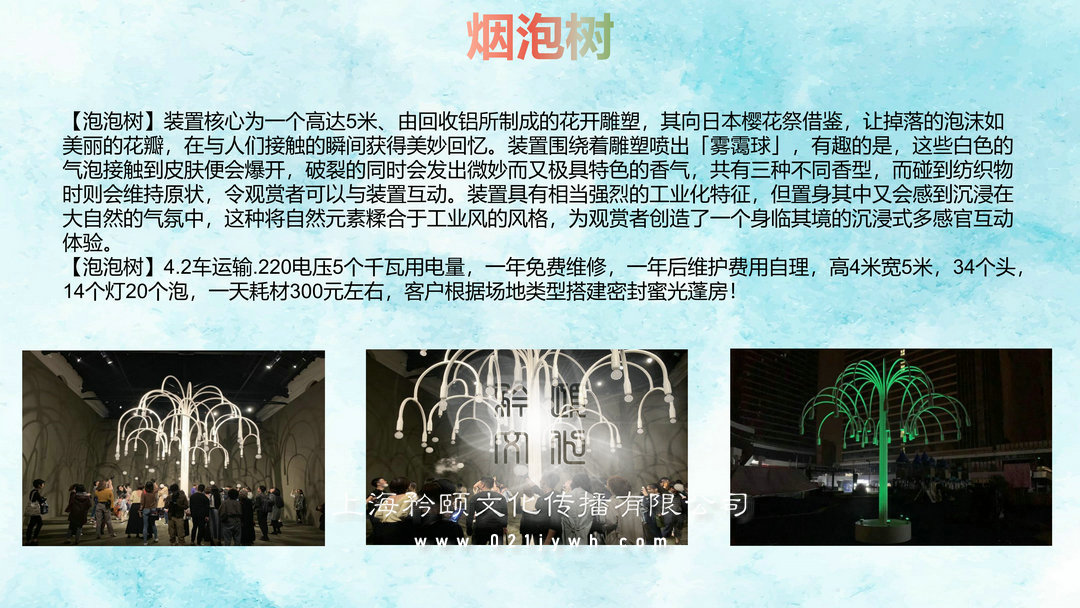 【泡泡樹】4.2車運輸.220電壓5個千瓦用電量,一年免費維修,一年后維護費用自理,高4米寬5米,34個頭,14個燈20個泡,一天耗材300元左右,客戶根據(jù)場地類型搭建密封蜜光蓬房!