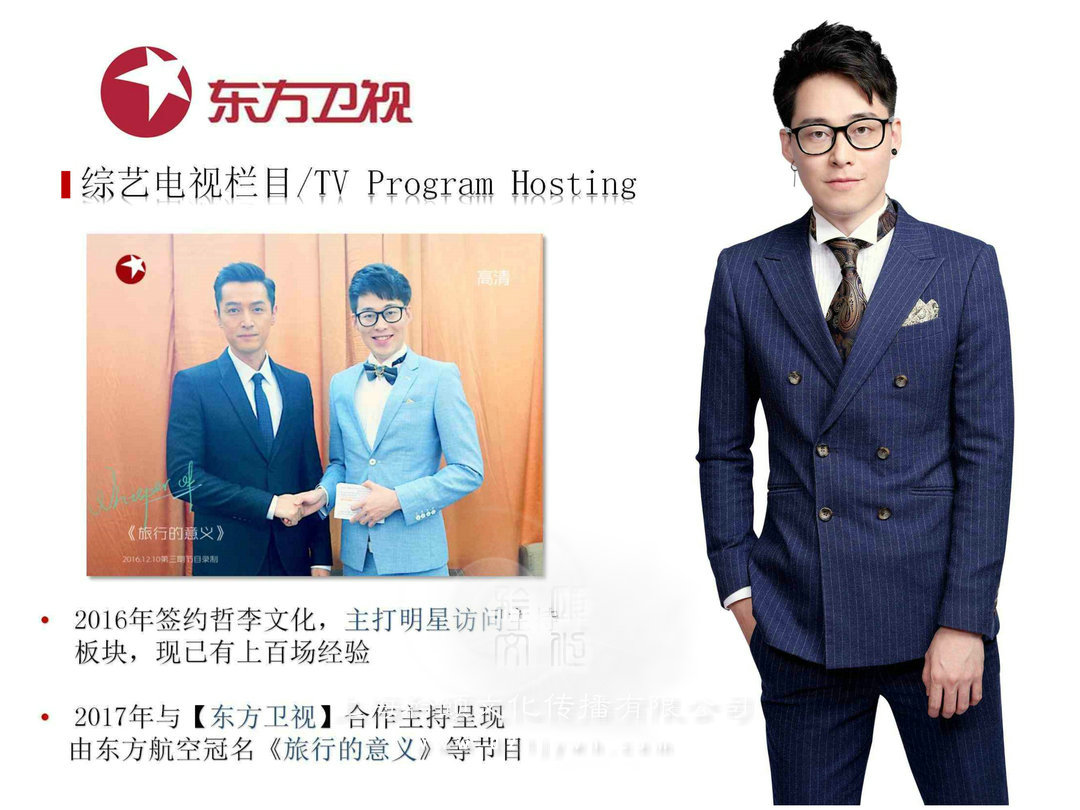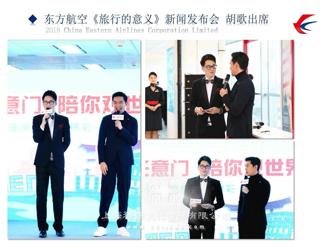 • 2017年與東方衛(wèi)視合作主持呈現(xiàn)由東方航空冠名《旅行的意義》 搭檔胡歌