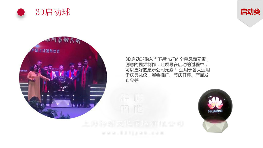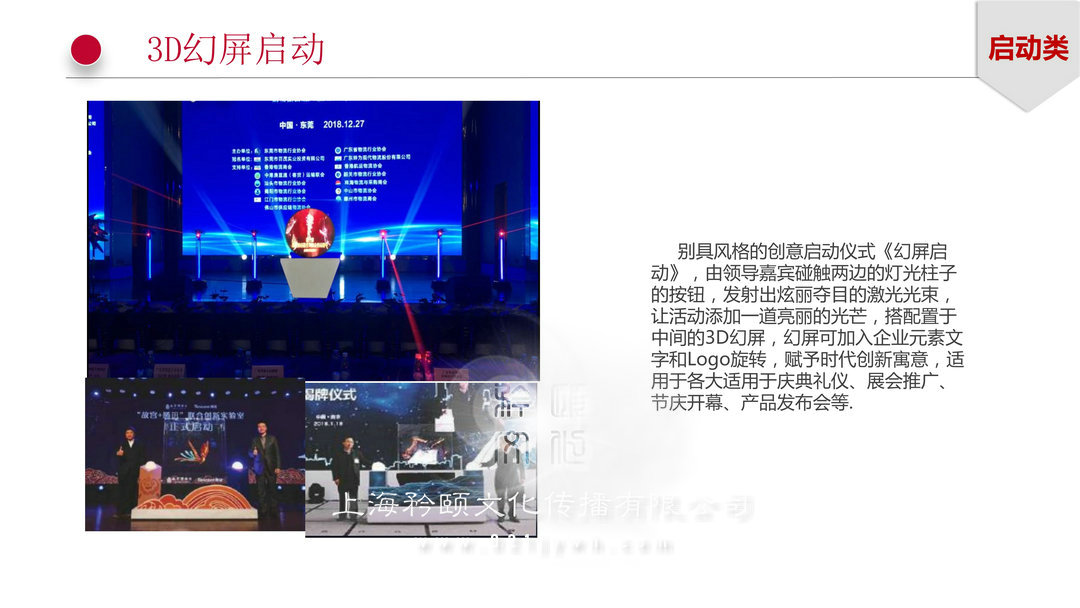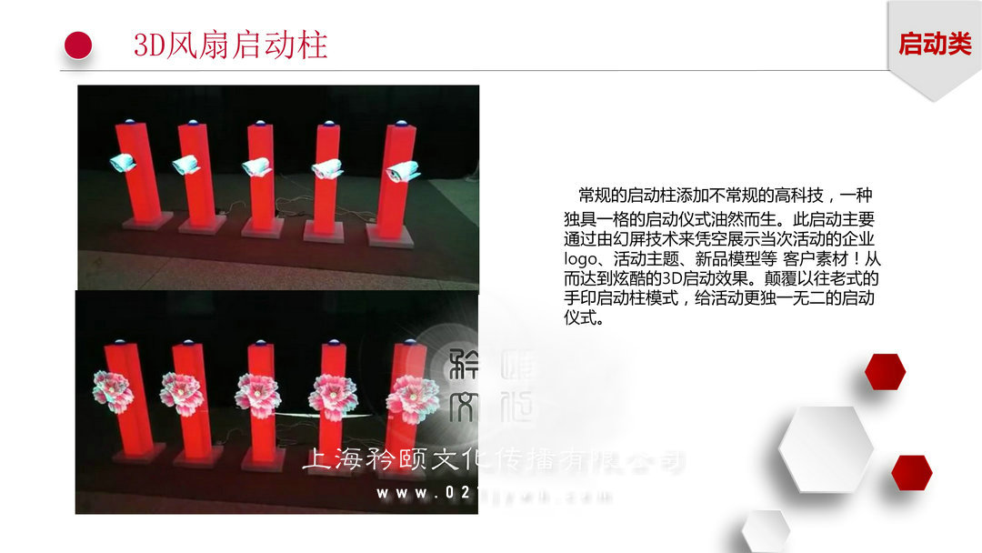 別具風格的創(chuàng)意啟動儀式《幻屏啟動》,由領導嘉賓碰觸兩邊的燈光柱子的按鈕,發(fā)射出炫麗奪目的激光光束,讓活動添加一道亮麗的光芒,搭配置于中間的3D幻屏,幻屏可加入企業(yè)元素文字和Logo旋轉(zhuǎn),賦予時代創(chuàng)新寓意,適用于各大適用于慶典禮儀、展會推廣、節(jié)慶開幕、產(chǎn)品發(fā)布會等.3D啟動球啟動類3D啟動球融入當下最流行的全息風扇元素,創(chuàng)意的視頻制作,讓領導在啟動的過程中,可以更好的展示公司元素!適用于各大適用于慶典禮儀、展會推廣、節(jié)慶開幕、產(chǎn)品發(fā)布會等.3D風扇啟動柱啟動類常規(guī)的啟動柱添加不常規(guī)的高科技,一種獨具一格的啟動儀式油然而生。此啟動主要通過由幻屏技術來憑空展示當次活動的企業(yè)logo、活動主題、新品模型等客戶素材!從而達到炫酷的3D啟動效果。顛覆以往老式的手印啟動柱模式,給活動更獨一無二的啟動儀式。