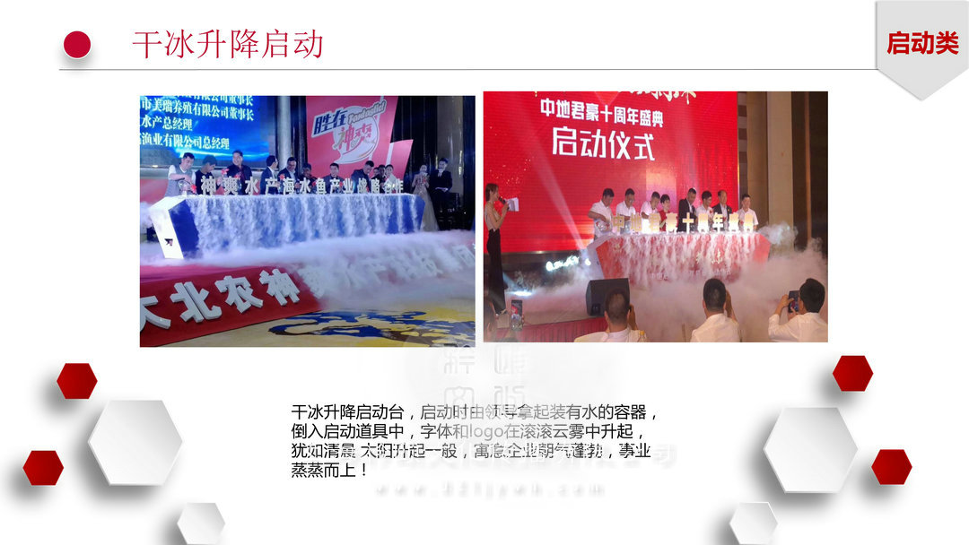 干冰升降啟動啟動類。干冰升降啟動臺,啟動時由領導拿起裝有水的容器,倒入啟動道具中,字體和logo在滾滾云霧中升起,猶如清晨太陽升起一般,寓意企業(yè)朝氣蓬勃,事業(yè)蒸蒸而上!