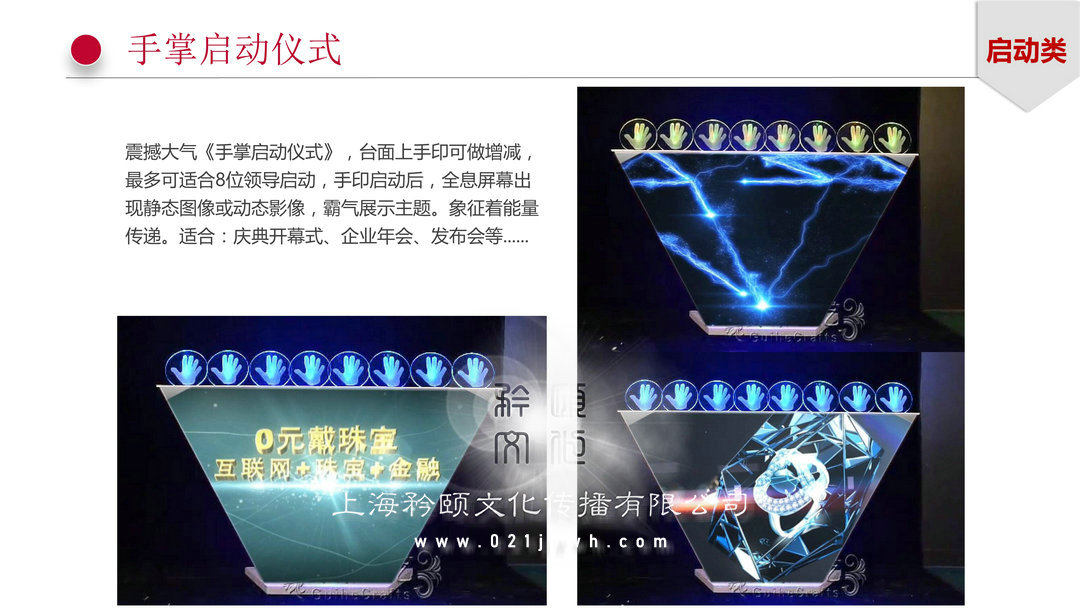 手掌啟動儀式啟動類,震撼大氣《手掌啟動儀式》,臺面上手印可做增減,最多可適合8位領導啟動,手印啟動后,全息屏幕出現(xiàn)靜態(tài)圖像或動態(tài)影像,霸氣展示主題。象征著能量傳遞。適合:慶典開幕式、企業(yè)年會、發(fā)布會等......
