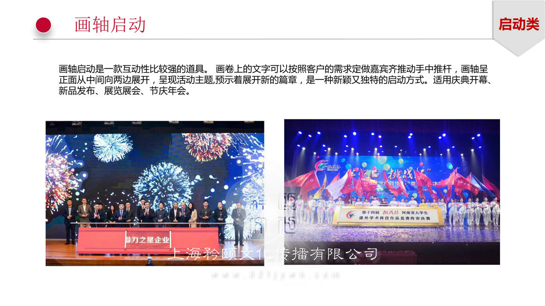 畫軸啟動啟動類。畫軸啟動是一款互動性比較強的道具。畫卷上的文字可以按照客戶的需求定做嘉賓齊推動手中推桿,畫軸呈正面從中間向兩邊展開,呈現(xiàn)活動主題,預示著展開新的篇章,是一種新穎又獨特的啟動方式。適用慶典開幕、新品發(fā)布、展覽展會、節(jié)慶年會。
