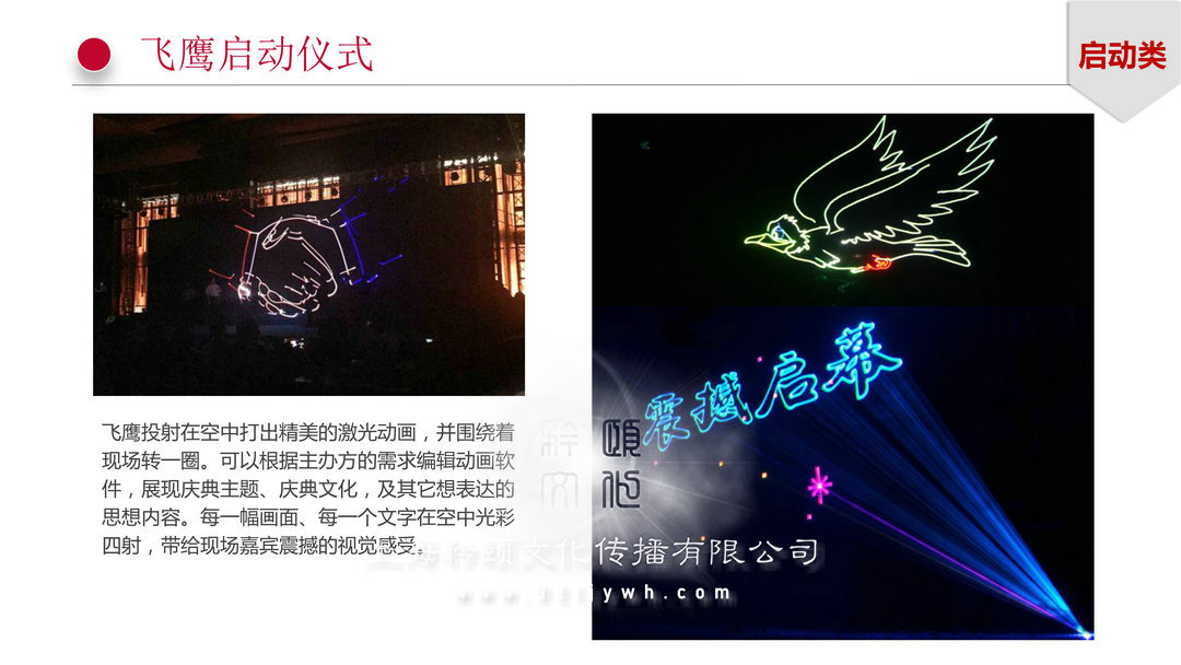 飛鷹啟動儀式啟動類,飛鷹投射在空中打出精美的激光動畫,并圍繞著現(xiàn)場轉(zhuǎn)一圈。可以根據(jù)主辦方的需求編輯動畫軟件,展現(xiàn)慶典主題、慶典文化,及其它想表達的思想內(nèi)容。每一幅畫面、每一個文字在空中光彩四射,帶給現(xiàn)場嘉賓震撼的視覺感受。