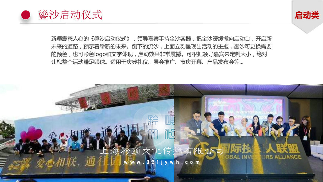 鎏沙啟動儀式啟動類,新穎震撼人心的《鎏沙啟動儀式》,領導嘉賓手持金沙容器,把金沙緩緩撒向啟動臺,開啟新未來的道路,預示著嶄新的未來。倒下的流沙,上面立刻呈出活動的主題,鎏沙可更換需要的顏色,也可彩色logo和文字體現(xiàn),啟動效果非常震撼。可根據(jù)領導嘉賓來定制大小,絕對讓您整個活動賺足眼球。適用于慶典禮儀、展會推廣、節(jié)慶開幕、產(chǎn)品發(fā)布會等...