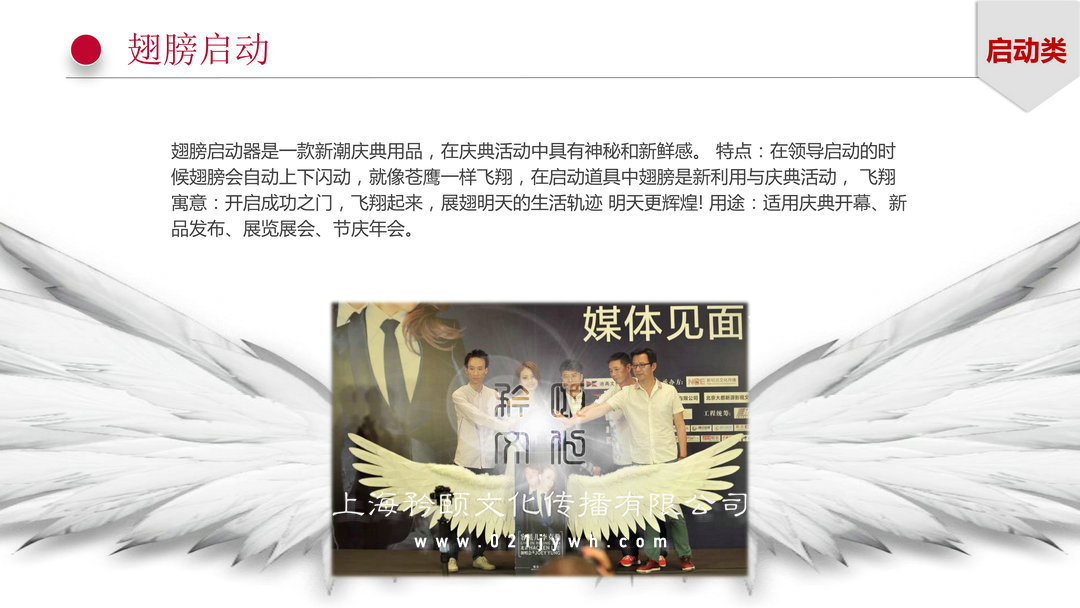 翅膀啟動啟動類,翅膀啟動器是一款新潮慶典用品,在慶典活動中具有神秘和新鮮感。特點:在領導啟動的時候翅膀會自動上下閃動,就像蒼鷹一樣飛翔,在啟動道具中翅膀是新利用與慶典活動,飛翔寓意:開啟成功之門,飛翔起來,展翅明天的生活軌跡明天更輝煌!用途:適用慶典開幕、新品發(fā)布、展覽展會、節(jié)慶年會。