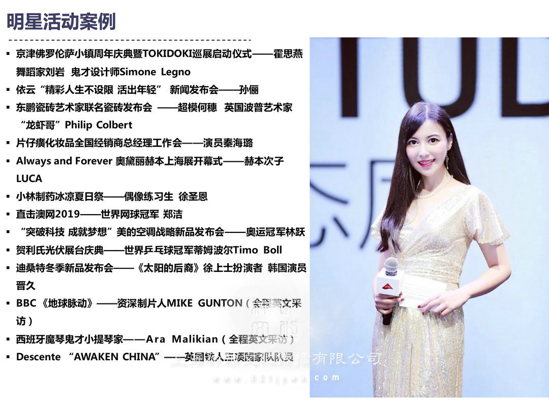 主持風(fēng)格Style 大氣成熟 應(yīng)變能力強(qiáng) 適應(yīng)各類(lèi)型中英雙語(yǔ)主持