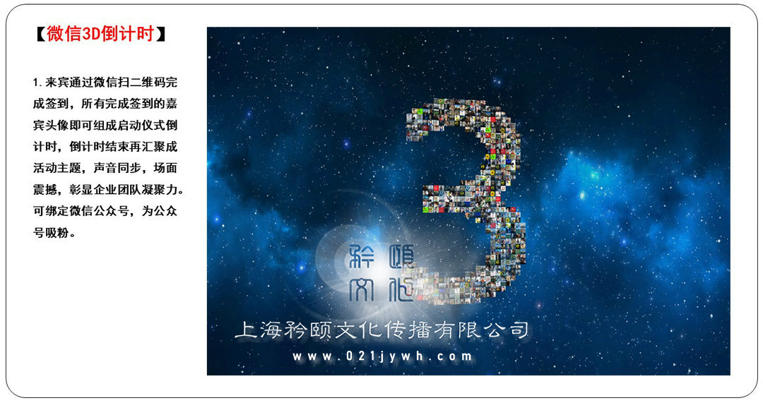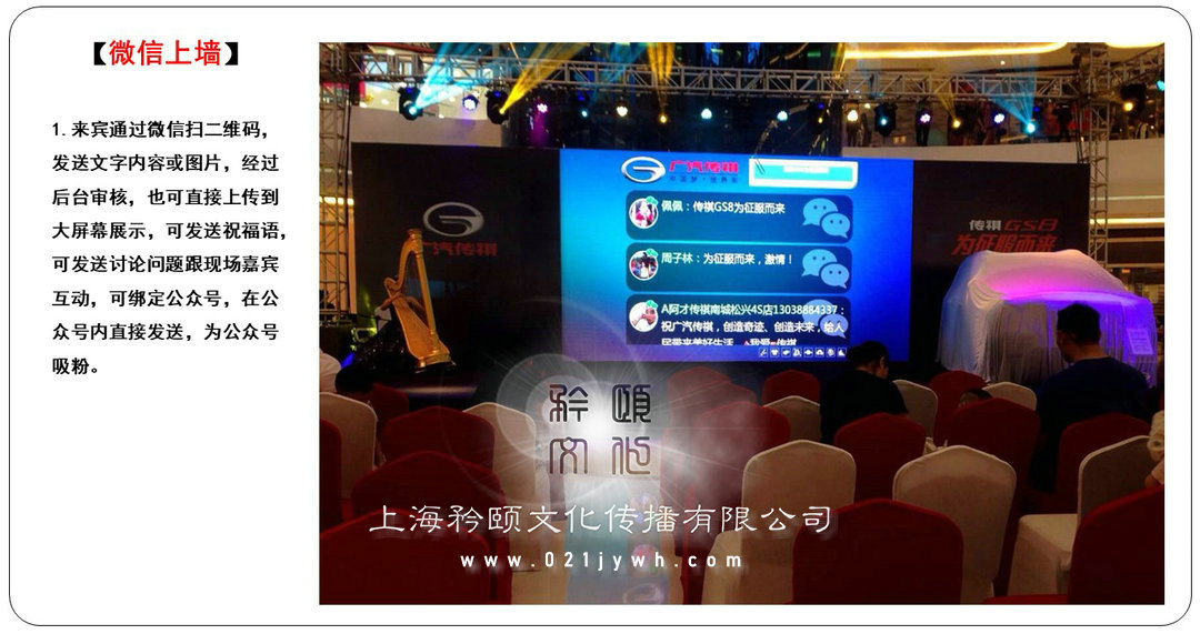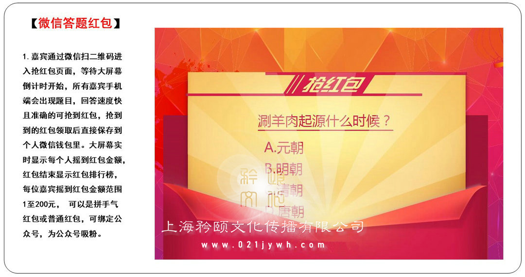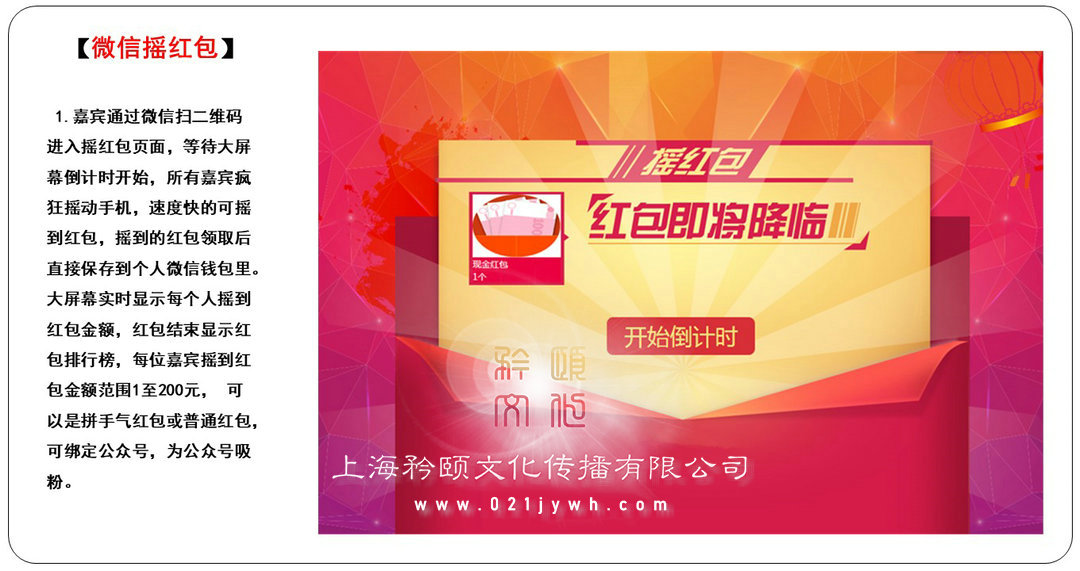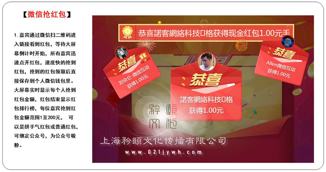 1.嘉賓通過(guò)微信掃二維碼進(jìn)入鏈接看到紅包,等待大屏幕倒計(jì)時(shí)開始,所有嘉賓迅速點(diǎn)開紅包,速度快的搶到紅包,搶到的紅包領(lǐng)取后直接保存到個(gè)人微信錢包里。大屏幕實(shí)時(shí)顯示每個(gè)人搶到紅包金額,紅包結(jié)束顯示紅包排行榜,每位嘉賓搶到紅包金額范圍1至200元, 可以是拼手氣紅包或普通紅包,可綁定公眾號(hào),為公眾號(hào)吸粉。1.嘉賓通過(guò)微信掃二維碼進(jìn)入搶紅包頁(yè)面,等待大屏幕倒計(jì)時(shí)開始,所有嘉賓手機(jī)端會(huì)出現(xiàn)題目,回答速度快且準(zhǔn)確的可搶到紅包,搶到到的紅包領(lǐng)取后直接保存到個(gè)人微信錢包里。大屏幕實(shí)時(shí)顯示每個(gè)人搖到紅包金額,紅包結(jié)束顯示紅包排行榜,上?;顒?dòng)公司搖到紅包金額范圍1至200元, 可以是拼手氣紅包或普通紅包,可綁定公眾號(hào),為公眾號(hào)吸粉。