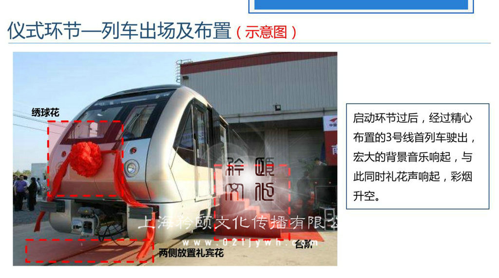 儀式環(huán)節(jié)—列車出場及布置啟動環(huán)節(jié)過后,經(jīng)過精心布置的3號線首列車駛出,宏大的背景音樂響起,與此同時禮花聲響起,彩煙升空。