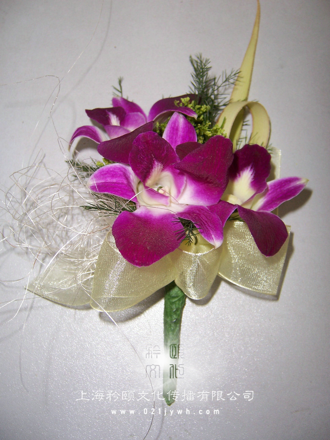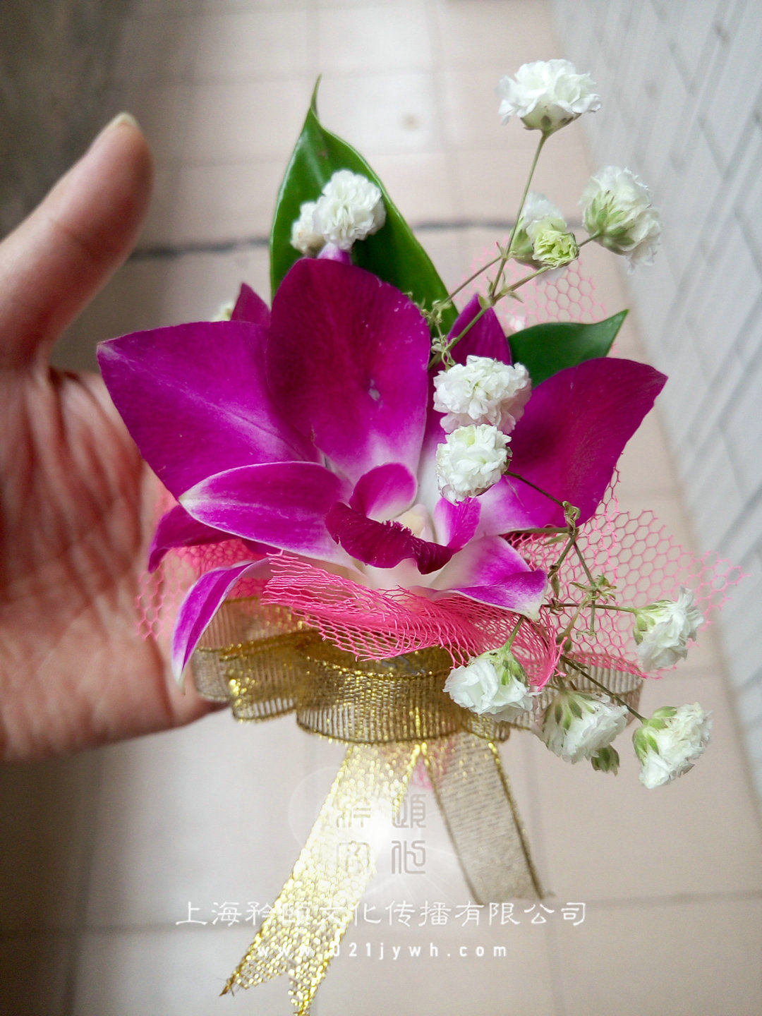串成,別在婦女胸前。而在西方國家,胸前花飾主要使衣服更為華麗。某些國家的習俗是:當一位男士約會時,必定會在約會前的兩上小時,送一束小花飾給女士,并且讓她在約會時別在衣服上。因此,胸花制作多取美色又自然的花材。由于胸花無法浸水,所以,必須選擇比較耐久的葉片。此外,將花枝軟的花朵用別針固定,也可達到持久不萎垂的效果。