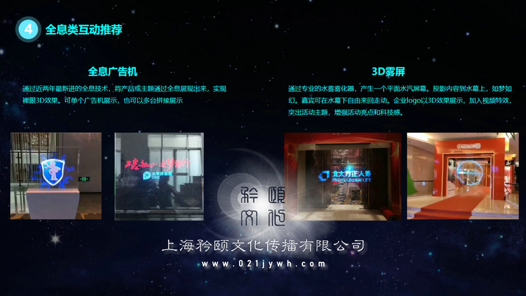 3D霧屏,通過(guò)專業(yè)的水霧霧化器,產(chǎn)生一一個(gè)平面水氵氣屏幕。投影內(nèi)容到水幕上,如夢(mèng)如幻。嘉賓可在水幕下自由來(lái)回走動(dòng)。企業(yè)|ogo以3D效果展示,加入視頻特效突出活動(dòng)主題,增強(qiáng)活動(dòng)點(diǎn)和科技感。