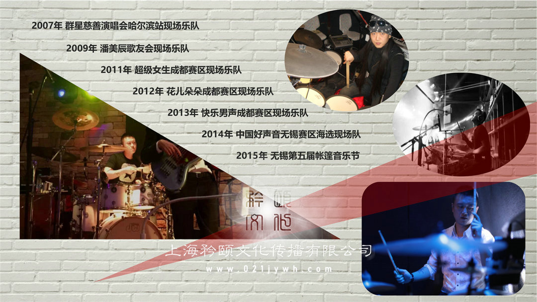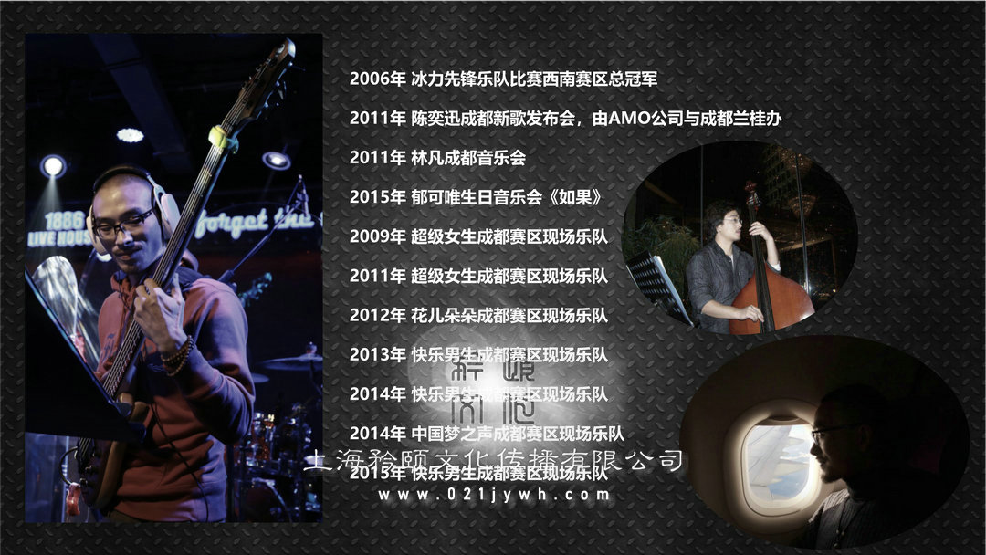 2006年?冰力先鋒樂隊比賽西南賽區(qū)總冠軍、2011年?陳奕迅成都新歌發(fā)布會,由AMO公司與成都蘭桂辦、2011年?林凡成都音樂會、2015年?郁可唯生日音樂會《如果》、2009年?超級女生成都賽區(qū)現(xiàn)場樂隊、2011年?超級女生成都賽區(qū)現(xiàn)場樂隊、2012年?花兒朵朵成都賽區(qū)現(xiàn)場樂隊、2013年?快樂男生成都賽區(qū)現(xiàn)場樂隊、2014年?快樂男生成都賽區(qū)現(xiàn)場樂隊、2014年?中國夢之聲成都賽區(qū)現(xiàn)場樂隊、2015年?快樂男生成都賽區(qū)現(xiàn)場樂隊