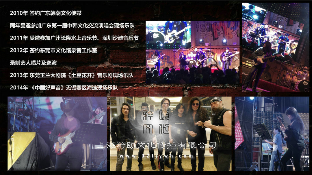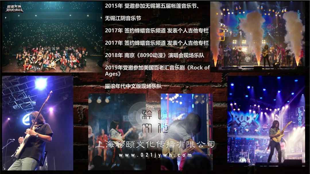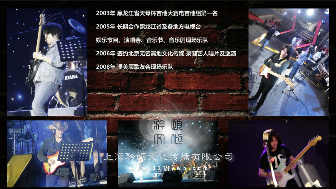 2003年?黑龍江省天琴杯吉他大賽電吉他組第一名,2005年?長期合作黑龍江省及各地方電視臺,娛樂節(jié)目、演唱會、音樂節(jié)、音樂劇現(xiàn)場樂隊,2006年?簽約北京無名高地文化傳媒?錄制藝人唱片及巡演,2008年?潘美辰歌友會現(xiàn)場樂隊,同年受邀參加廣東第一屆中韓文化交流演唱會現(xiàn)場樂隊2011年?受邀參加廣州長隆水上音樂節(jié)、深圳沙灘音樂節(jié)2012年?簽約東莞市文化館錄音工作室錄制藝人唱片及巡演,2013年?東莞玉蘭大劇院《土豆花開》音樂劇現(xiàn)場樂隊,2014年?《中國好聲音》無錫賽區(qū)海選現(xiàn)場樂隊,2015年?受邀參加無錫第五屆帳篷音樂節(jié)、無錫江陰音樂節(jié),2017年?簽約蜂蠟音樂頻道?發(fā)表個人吉他專欄,2017年?簽約蜂蠟音樂頻道?發(fā)表個人吉他專欄,2018年?南京《8090動漫》演唱會現(xiàn)場樂隊,2019年受邀參加美國百老匯音樂劇《Rock?of?Ages》,搖滾年代中文版現(xiàn)場樂隊