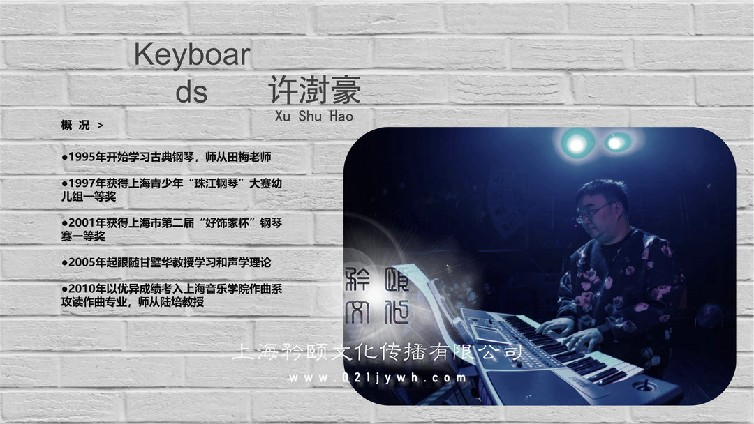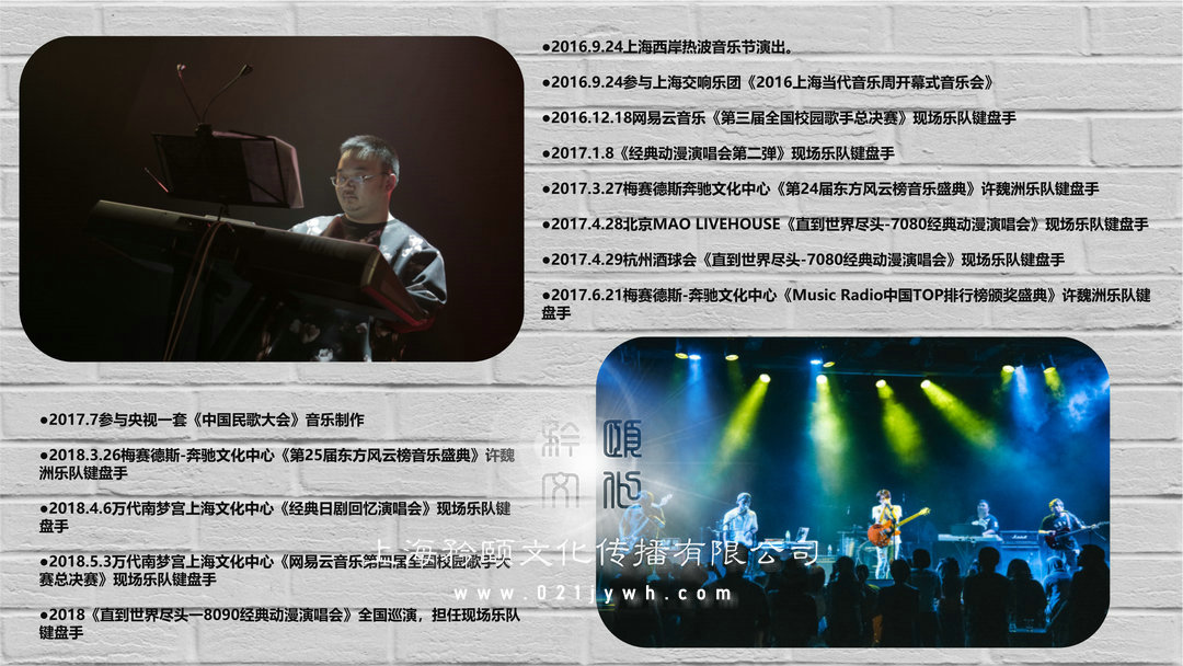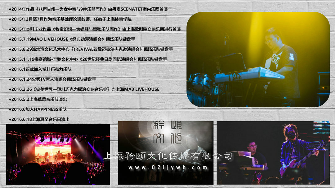 攻讀作曲專業(yè),師從陸培教●2014年作品《八聲甘州一為女中音與9件樂器而作》由丹麥SCENATET室內(nèi)樂團(tuán)首演?●2015年3月至7月作為音樂基礎(chǔ)理論課教師,任教于上海體育學(xué)院●2015年本科畢業(yè)作品《牧童幻想一為鋼琴與管弦樂隊而作》由上海歌劇院交響樂團(tuán)進(jìn)行首●2015.7.19MAO?LIVEHOUSE《經(jīng)典動漫演唱會》現(xiàn)場樂隊鍵盤手●2015.8.29淺水灣文化藝術(shù)中心《(REVIVAL致敬邁克爾杰克遜演唱會》現(xiàn)場樂隊鍵盤手●2015.11.19梅賽德斯-奔馳文化中心《20世紀(jì)經(jīng)典日劇回憶演唱會》現(xiàn)場樂隊鍵盤手●2016.1正式加入塑料巧克力樂隊●2016.1.24火秀TV素人演唱會現(xiàn)場樂隊鍵盤手●2016.3.26《完美世界一塑料巧克力搖滾交響音樂會》@上海MA0?LIVEHOUSE●2016.5.2上海草莓音樂節(jié)演出2016.6加入HAPPINESS樂隊●2016.6.18上海夏至音樂日演出●2016.9.24上海西岸熱波音樂節(jié)演出?!?016.9.24參與上海交響樂團(tuán)《2016上海當(dāng)代音樂周開幕式音樂會》●2016.12.18網(wǎng)易云音樂《第三屆全國校園歌手總決賽》現(xiàn)場樂隊鍵盤手●2017.1.8《經(jīng)典動漫演唱會第二彈》現(xiàn)場樂隊鍵盤手