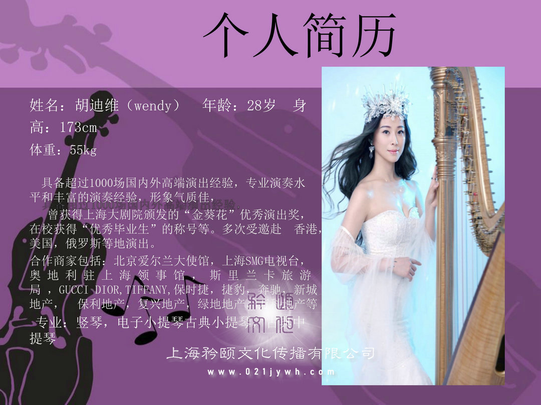 具超過1000場國內(nèi)外高端演出經(jīng)驗,專業(yè)演奏水和豐富的演奏經(jīng)驗,形象氣質(zhì)佳,曾得上海大劇院頒發(fā)的“金葵花”優(yōu)秀演出獎,多次受邀赴香港,俄羅等地演出。