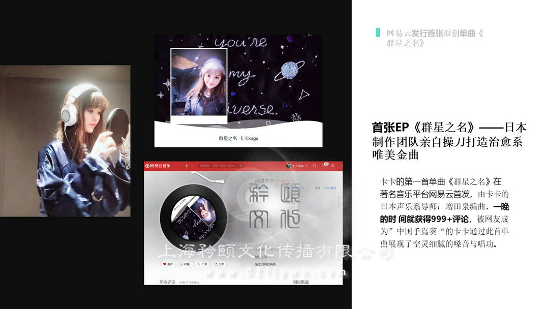 首張EP《群星之名》——日本制作團(tuán)隊(duì)親自操刀打造治愈系唯美金曲上海日語(yǔ)女歌手的第一首單曲《群星之名》在 著名音樂平臺(tái)網(wǎng)易云首發(fā),由上海日語(yǔ)女歌手的日本聲樂系導(dǎo)師:增田泉編曲,一晚的時(shí) 間就獲得999+評(píng)論,被網(wǎng)友成為”中國(guó)手嶌葵“的上海日語(yǔ)女歌手通過此首單曲展現(xiàn)了空靈細(xì)膩的嗓音與唱功。
