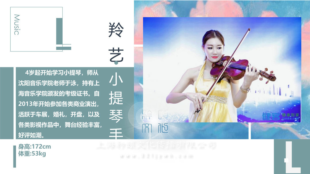 4歲起開始學習小提琴,師從沈陽音樂學院老師于泳,持有上海音樂學院頒發(fā)的考級證書。自2013年開始參加各類商業(yè)演出,活躍于車展,婚禮,開盤,以及