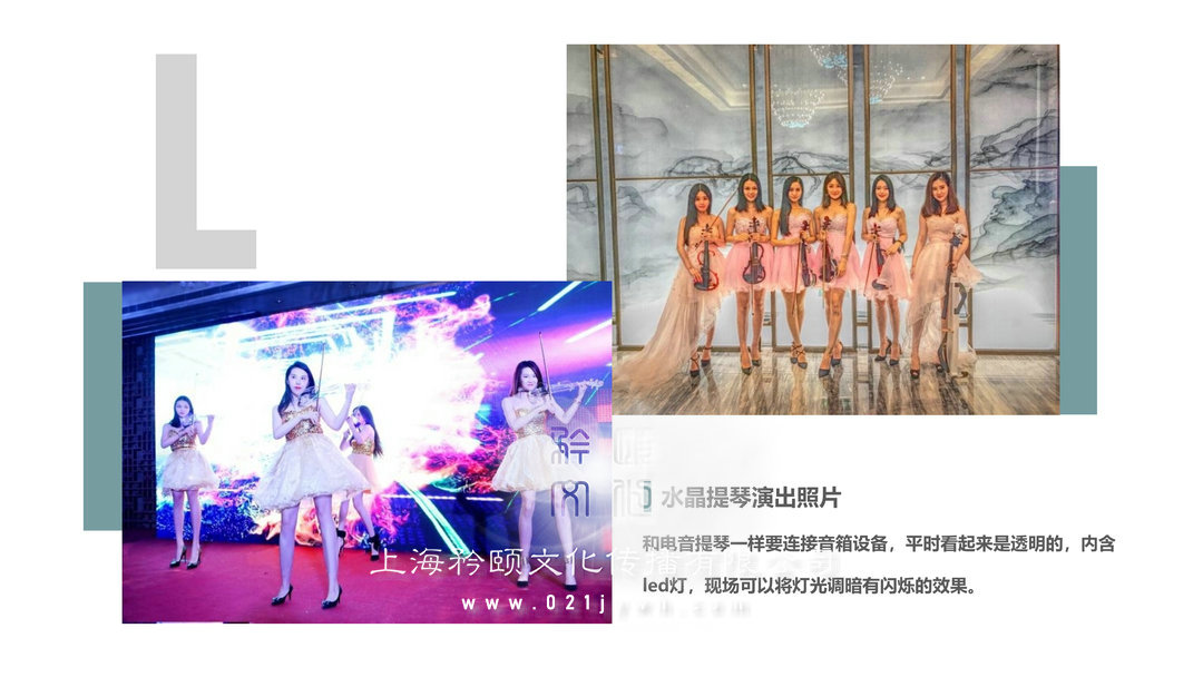 水晶提琴演出照片和電音提琴一樣要連接音箱設備,平時看起來是透明的,內(nèi)含led燈,現(xiàn)場可以將燈光調(diào)暗有閃爍的效果。