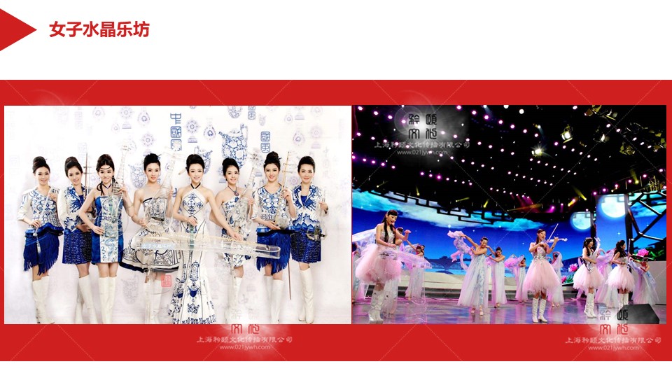 《女子水晶樂(lè)坊》是中國(guó)本土著名民族文化節(jié)目,她們是中國(guó)新一代的民族符號(hào),在器樂(lè)界傲居一線位置的新民樂(lè)團(tuán)隊(duì)!上海女子水晶樂(lè)坊留下了亮麗的身影和留戀的掌聲,把中國(guó)的古典與時(shí)尚創(chuàng)新和傳承到了精妙之處,用音樂(lè)的語(yǔ)言與世界各國(guó)人民進(jìn)行文化交流,增進(jìn)了友誼,同時(shí)為祖國(guó)的當(dāng)代形象做成了最美的一張名片!