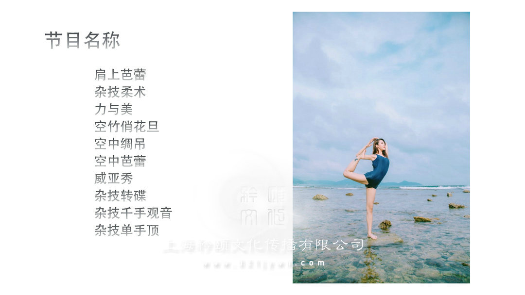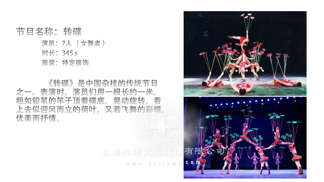 肩上芭蕾、雜技術、力與美、空竹俏花旦、空中綢吊、空中芭蕾、威亞秀、雜技轉碟、雜技千手觀音、雜技單手頂